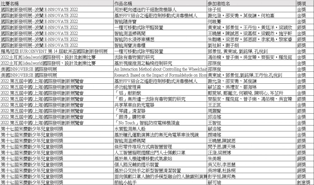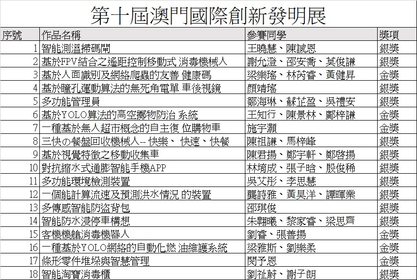 第十屆澳門國際創新發明展於10月13至15日在澳門科學館進行,本次活動吸引來自兩岸四地及多個國家或地區參與,本校共派出18件作品,獲得6項金獎及12項銀獎。此外,本校共有15位老師獲頒優秀園丁獎。同場舉行國際發明展頒獎禮,本校師生獲獎眾多,展現本校創新成果。獲獎名單詳看圖片。