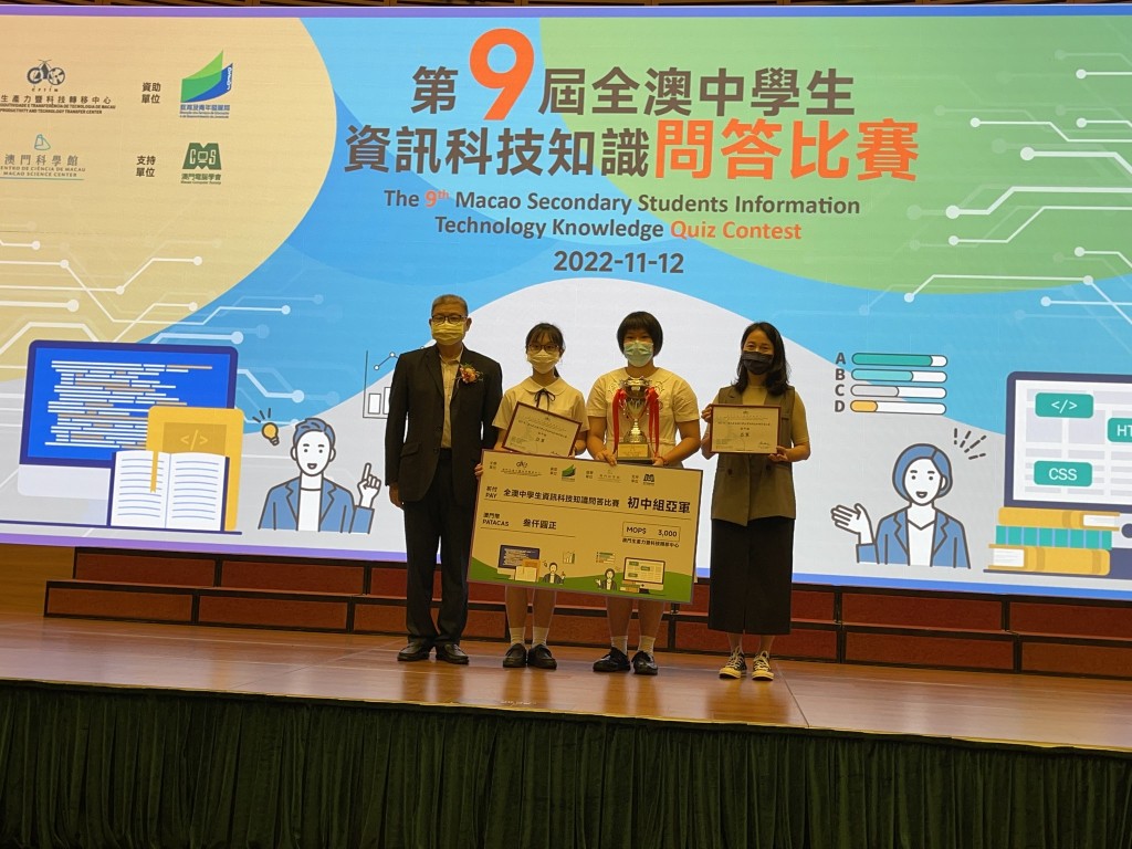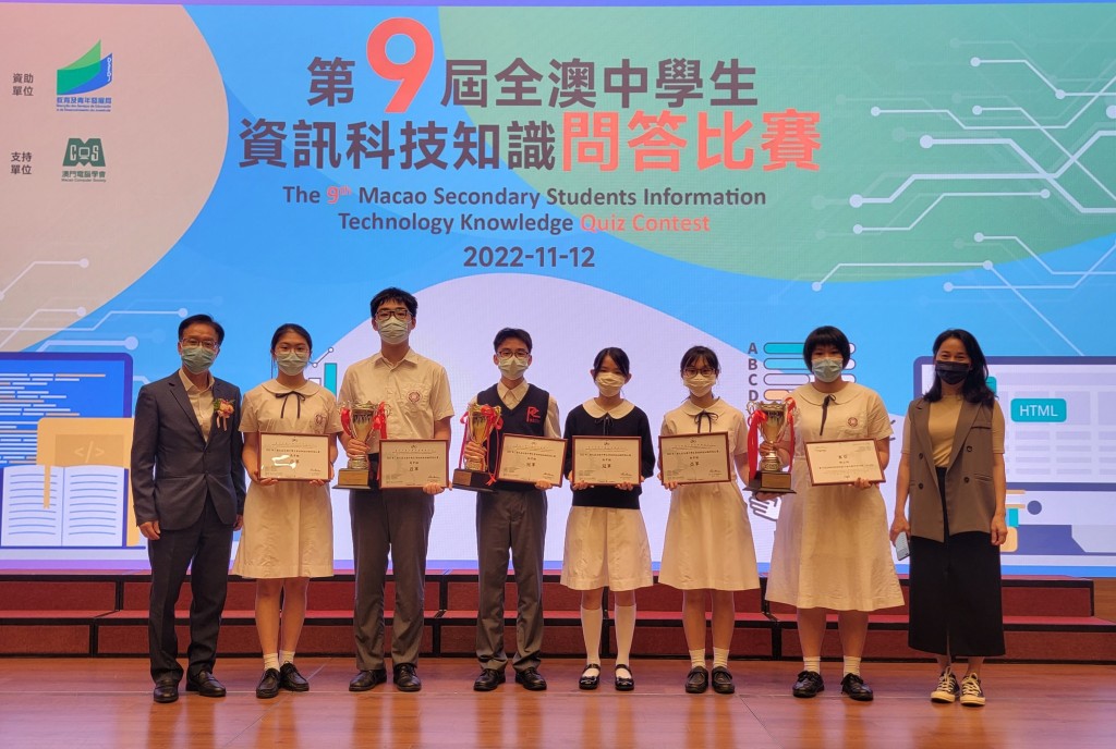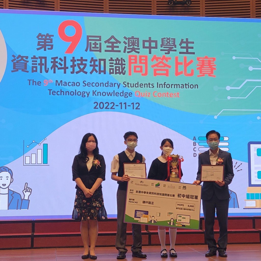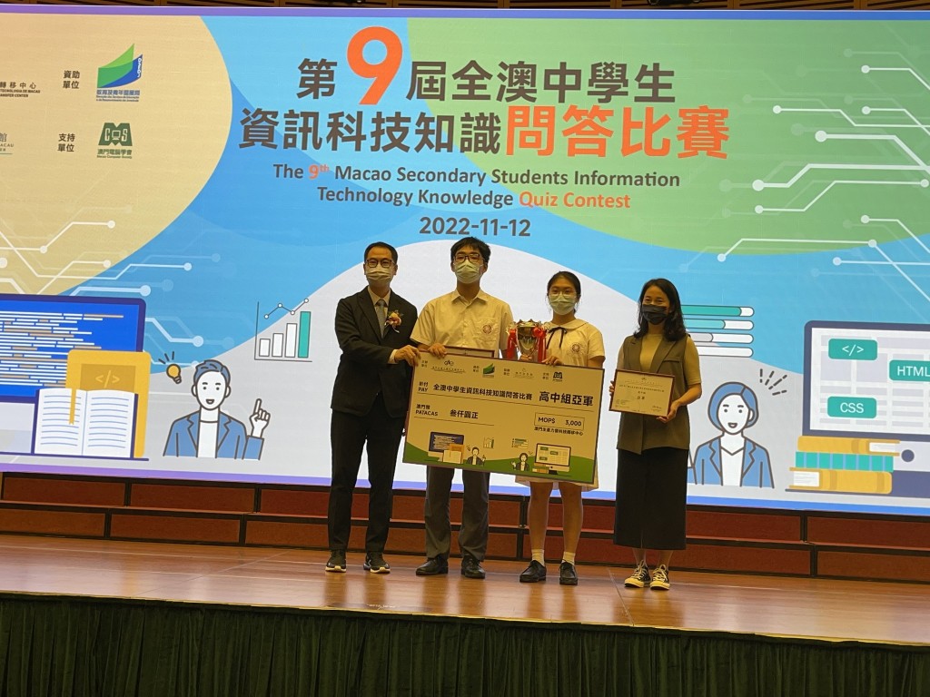 由澳門生產力暨科技轉移中心主辦、教育及青年發展局資助、澳門科學館協辦及澳門電腦學會支持的「第9屆全澳中學生資訊科技知識問答比賽」總決賽於今日圓滿結束。本校囊括初中組冠軍及亞軍,同時奪得高中組亞軍的優異成績。