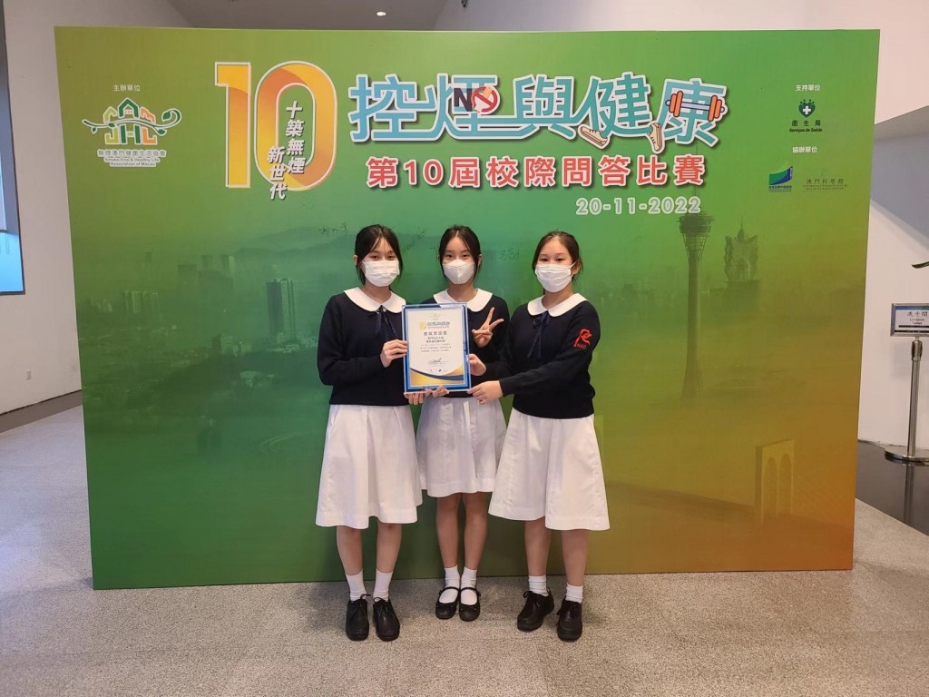 「第10屆控煙與健康校際問答比賽」今天舉行,全澳超過70支隊伍參加。經過數輪激烈的比賽,本校初三級學生楊梓涵、張善甯、陳倩樺獲優異獎。