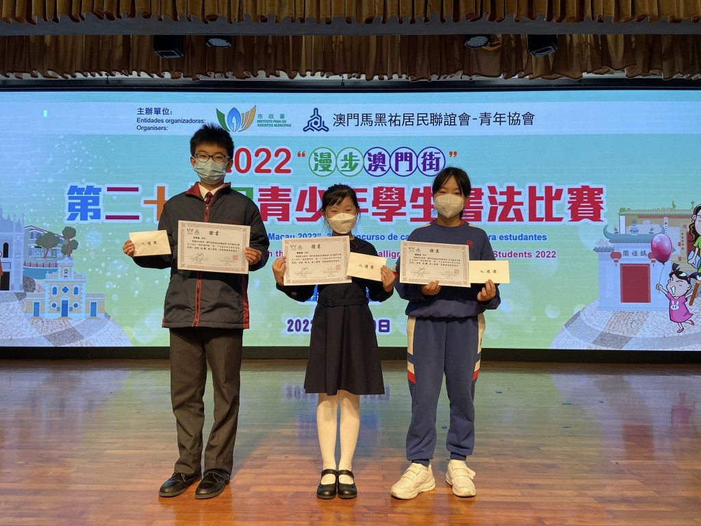 本校同學早前參加由市政署及澳門馬黑祐居民聯誼會青年協會主辦的2022“漫步澳門街”第二十七屆青少年學生書法比賽,昨天出席頒獎典禮。