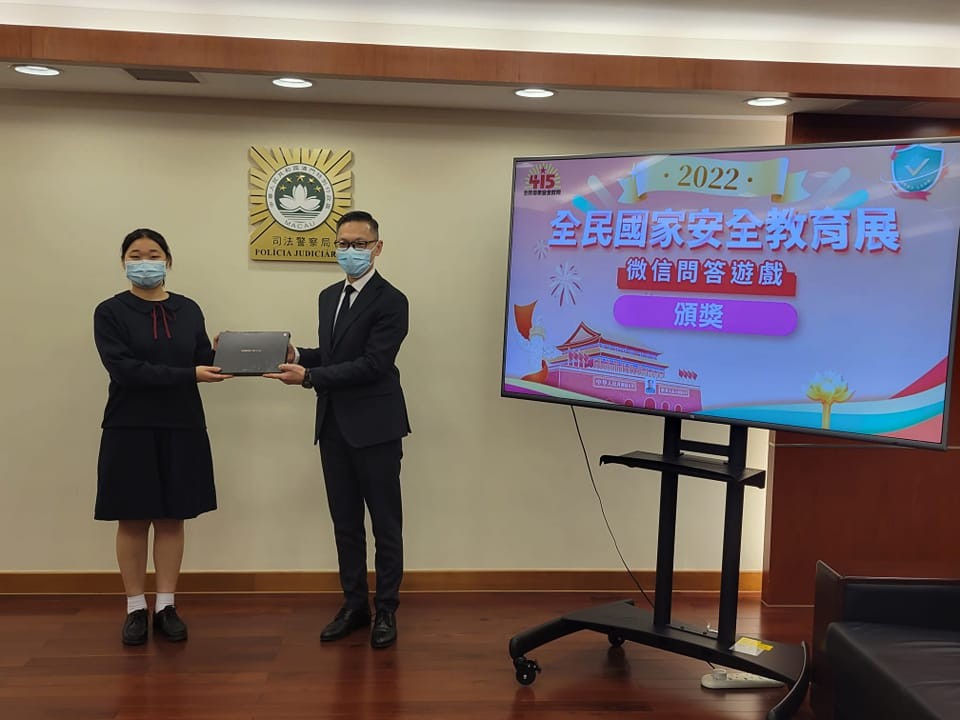 全民國家安全教育展微信問答遊戲揭曉,司法警察局局長薛仲明頒發大獎予本校鄭舜悅同學。