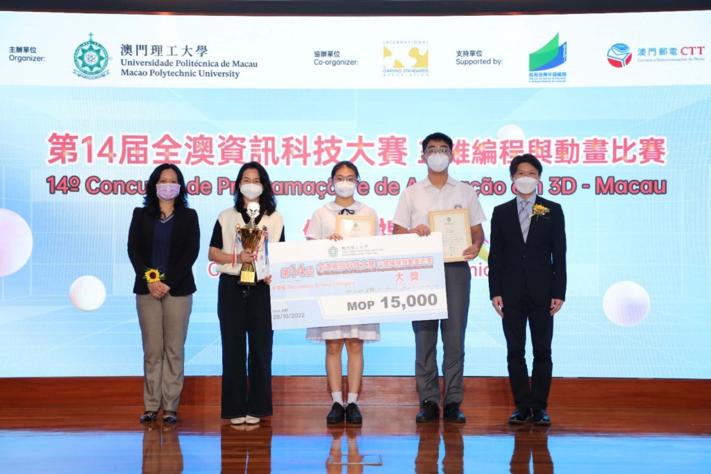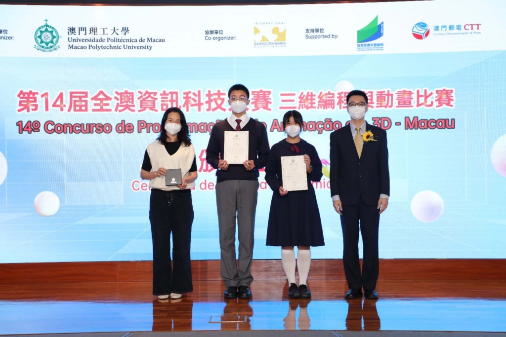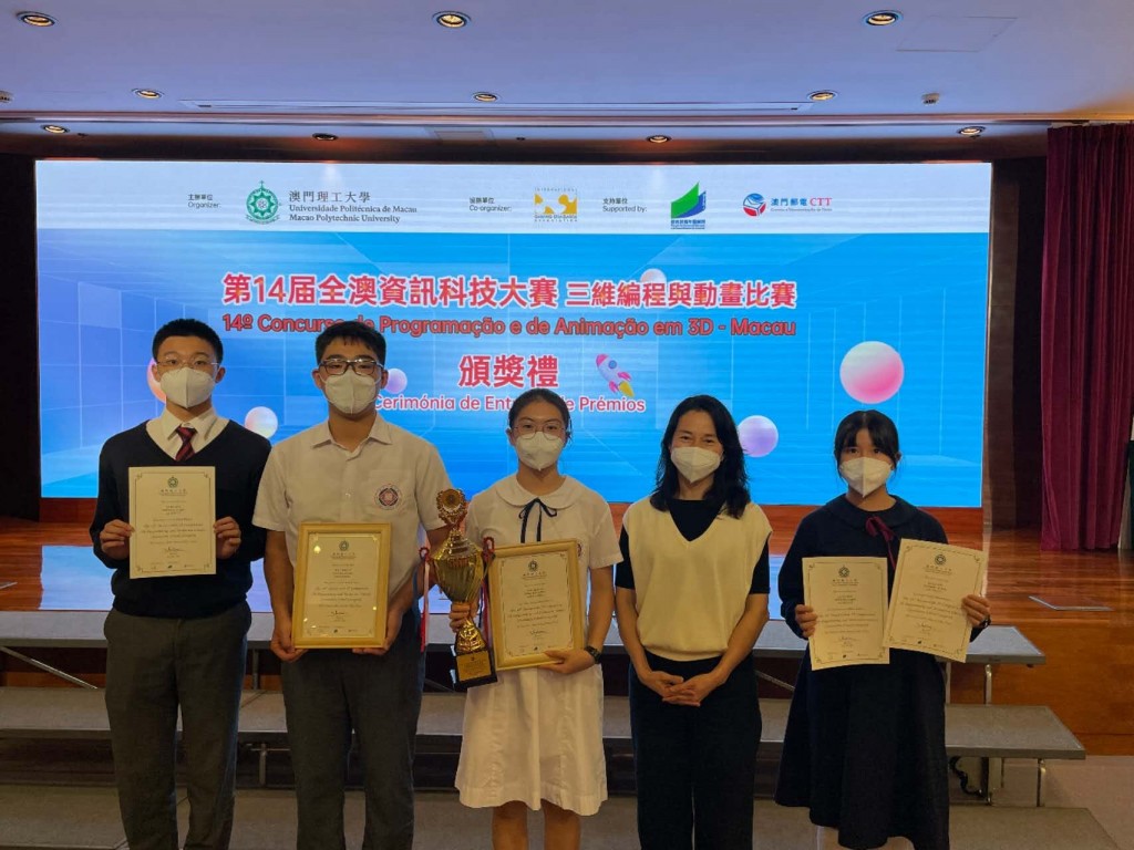 第14屆全澳資訊科技大賽三維編程與動畫比賽經過初賽及激烈的總決賽,我校同學在數百多名參賽者中脫穎而出。吳粲然、林煜翔及馮嘉尚獲得中學組最高獎項,並以唯一獲邀的中學組隊伍在頒獎典禮上展示其獲獎作品及分享心得,表現亮麗。