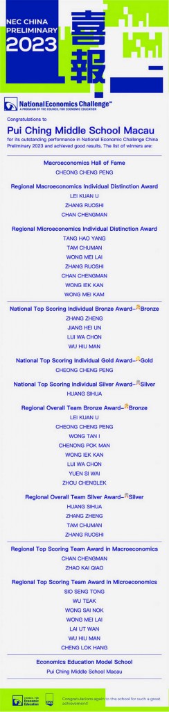 2023年美國經濟挑戰賽NEC中國初賽,全國共計2000多隊,10000多人參賽。我校參賽89人,獲獎累計38人次。是次比賽,我校高三信班張靖坪首次獲得宏觀經濟滿分(DR組別);高二愛班張若詩、譚貯文、黃思華團隊總分1010分為我校最高分(全國平均分829分 );張靖坪、黃思華個人總分全國排名前10%。