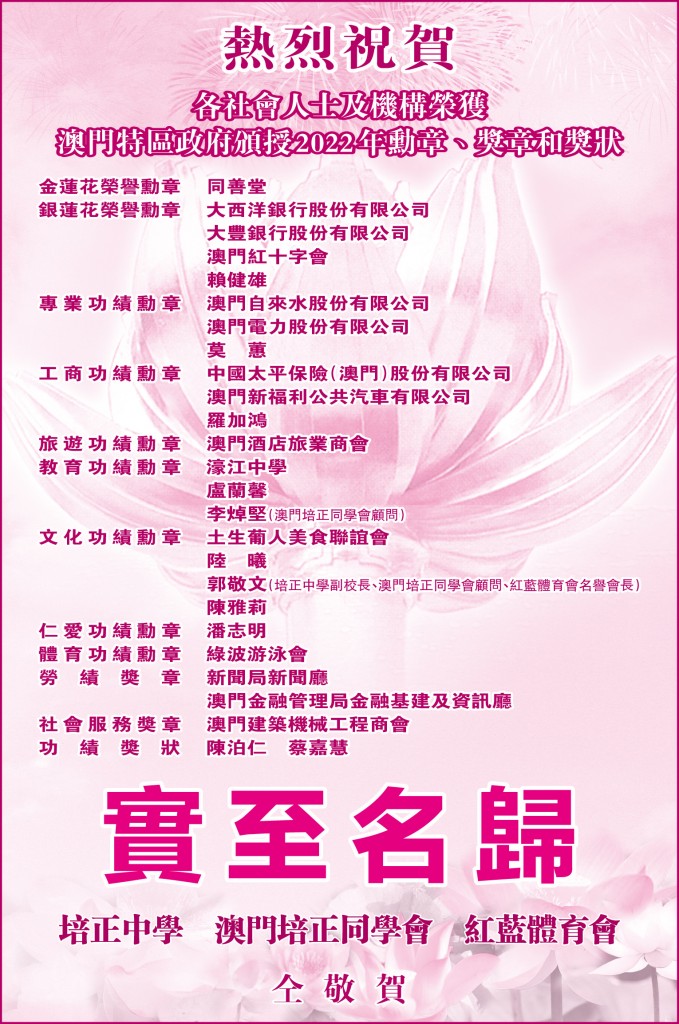 熱烈祝賀郭敬文副校長、各社會人士及機構榮獲澳門特區政府頒授2022年度勳章、獎章和獎狀。