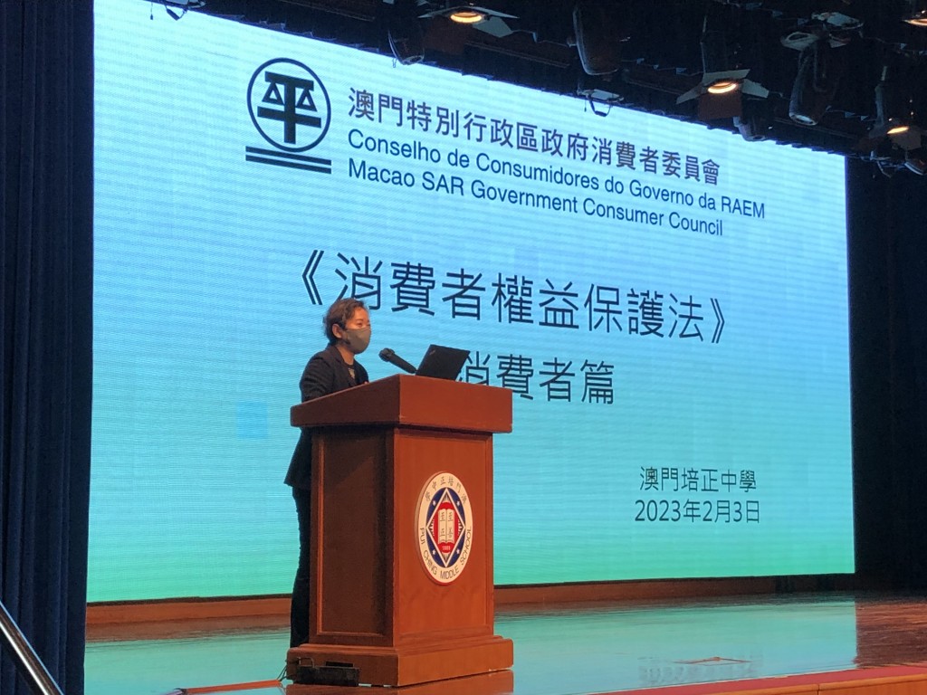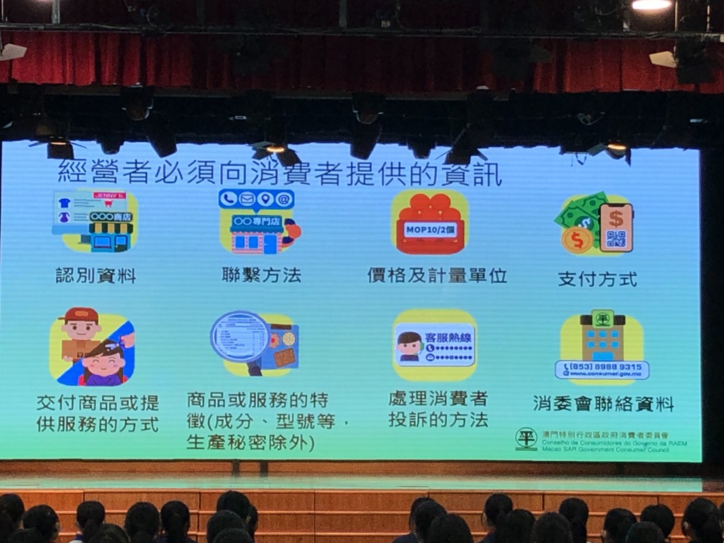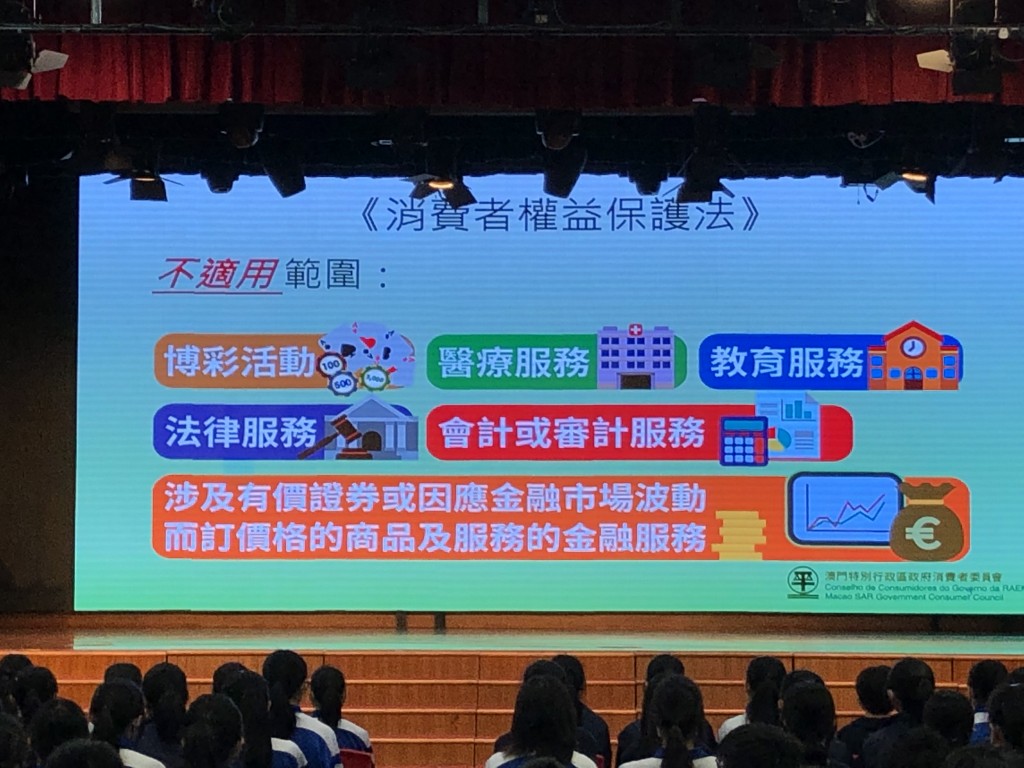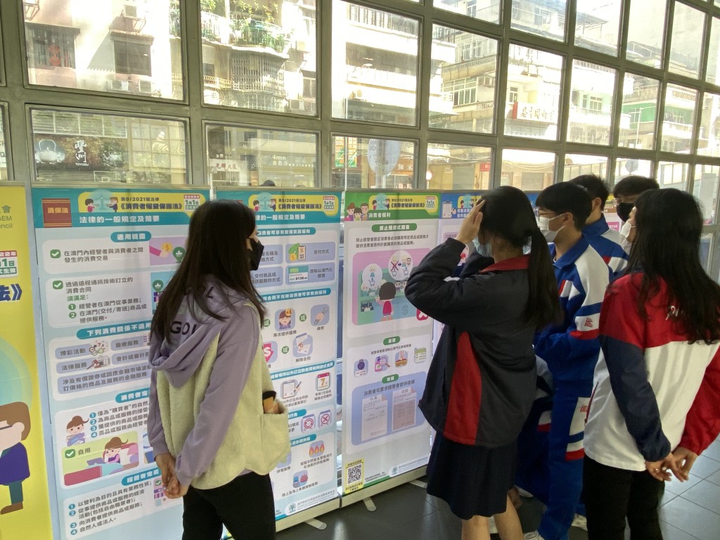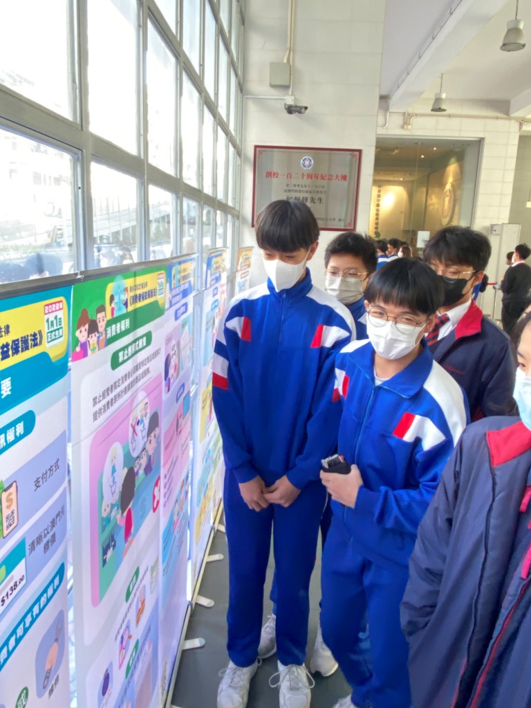 消費者委員會委派代表於2月3日到校與初三全級同學分享《消費者權益保護法》,講解消費者權益及不適用的範圍,當中清晰地列明經營者必須向消費者提供的資訊要求,學生積極投入,獲益良多。講解會後老師帶領同學到校園壁報區繼續分享教學,以了解更多的消費者權益。