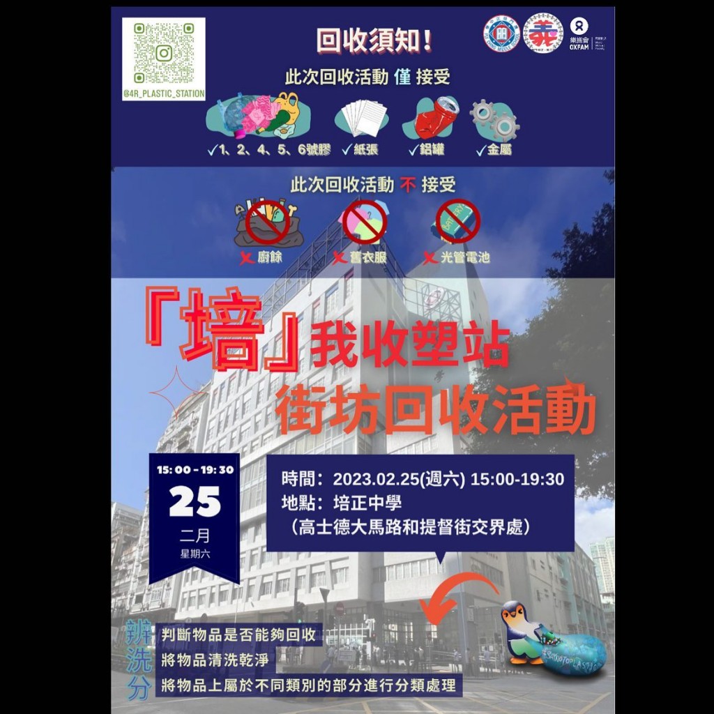 2月25日(六)15:00-19:30培正中學門口的灰地區域將設置回收站點,進行環保回收活動,詳細回收步驟可參閱海報。是次活動不止會回收塑膠,還會回收金屬,鋁罐及紙張,種類繁多。歡迎各位師生家長以及街坊朋友為環保出一分力,期待與大家見面。
