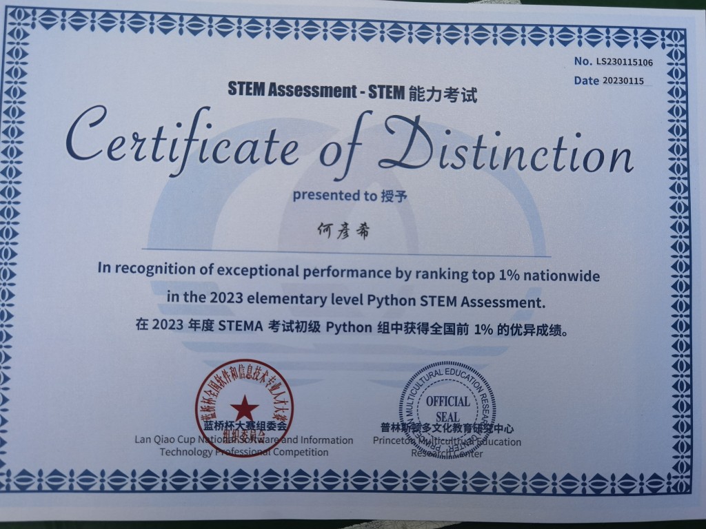 本校小四學生何彥希參加「藍橋杯STEM能力考試」,取得Python初級組別全國前 1%的優異成績,獲「TOP 1%」證書及奬盃。