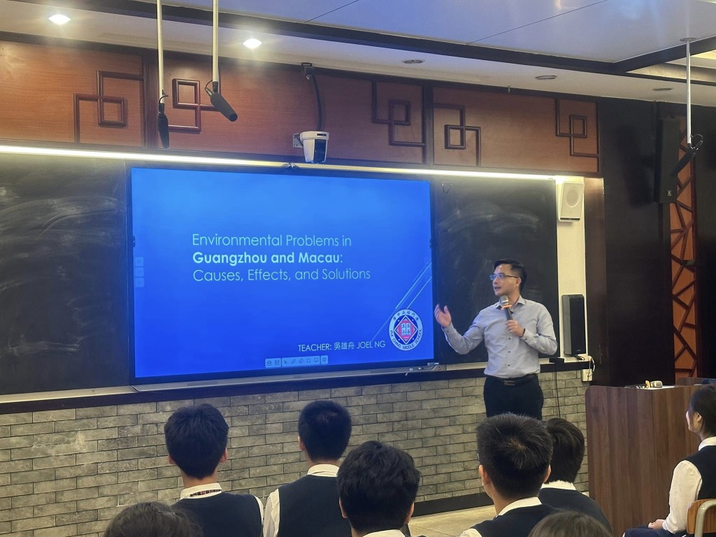 此外,本校英文副科主任吳雄舟老師亦獲邀擔任公開課嘉賓,以溫室效應和環境污染等為題開展了一節英語閱讀課,向初三港澳子弟班學生授課。學生在課堂中交流了粵澳兩地有關各項環境污染及日常生活中可行的解決方案,課堂氣氛熱烈,樂也融融。除了學習英語,同時激發學生的環保意識,融合多學科資源,擴展全球視野。