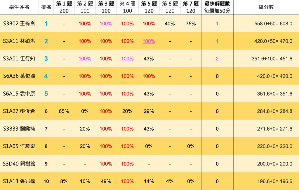 培正中學編程大賽(2022年度 科技周盃-個人賽) 結果公佈如圖: