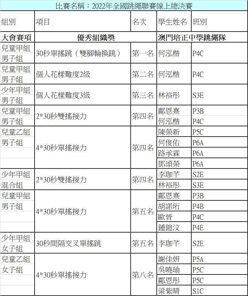 澳門培正中學跳繩隊在2022全國跳繩聯賽線上總決賽比賽中,喜獲一金、一銀、一銅及多項前八名的獎狀證書佳績,同時,再次獲賽會頒發優秀組織獎。