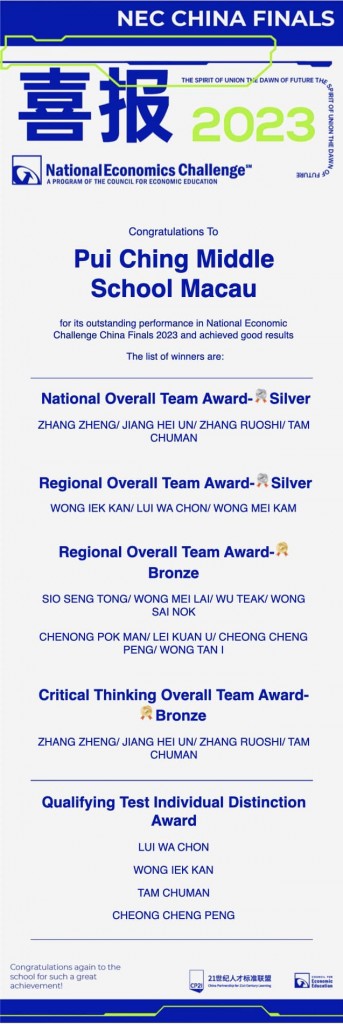 經過初賽的選拔,我校共有14位同學參加了全國決賽,與來自全國的4,000多位中學生角逐獎項。比賽分為Critical thinking(主觀案例分析與presentation)和經濟學原理客觀題等部分,我校同學取得了優異的成績,今年更是首次在總決賽中獲得全國銀獎。