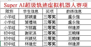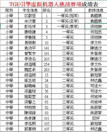 經過激烈角逐,我校學生在TGE引擎虛擬機器人挑戰賽項及Super AI超級軌跡虛擬機器人賽項中取得了優秀成績。特別值得一提的是,在TGE引擎虛擬機器人挑戰賽項小學組中,我校學生包攬了全國冠亞季,並取得了前五名的佳績。其中,頭五名學生分別為:區叡恆、余汶憲、彭裕祥、唐皓謙、李善施。