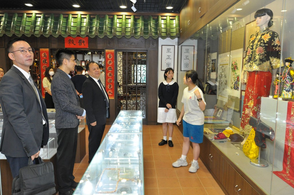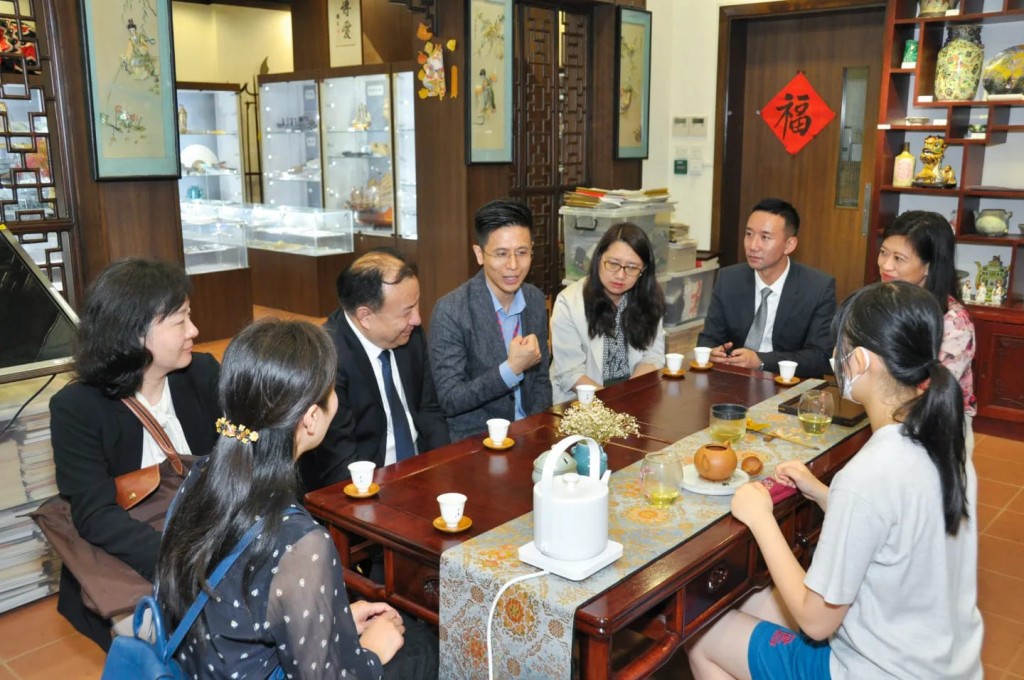 來訪嘉賓分別有江蘇省教育廳機關黨委周玖華副書記、江蘇省港澳台教育交流中心閻宇軍副主任、無錫市教育局蕭晶副局長、無錫市教育局港澳台教育事務辦公室徐黎明主任和江蘇省港澳台教育交流中心港澳台教育交流科陸姝珺科長。嘉賓們首先參觀了創新科教館,期間聽取師生們介紹科研項目,了解學習概況,並藉此機會向同學們介紹江蘇省的高等院校。而在中華文化館,同學們展示茶藝,介紹茶葉、泡茶、品茗,一眾來賓樂在其中。