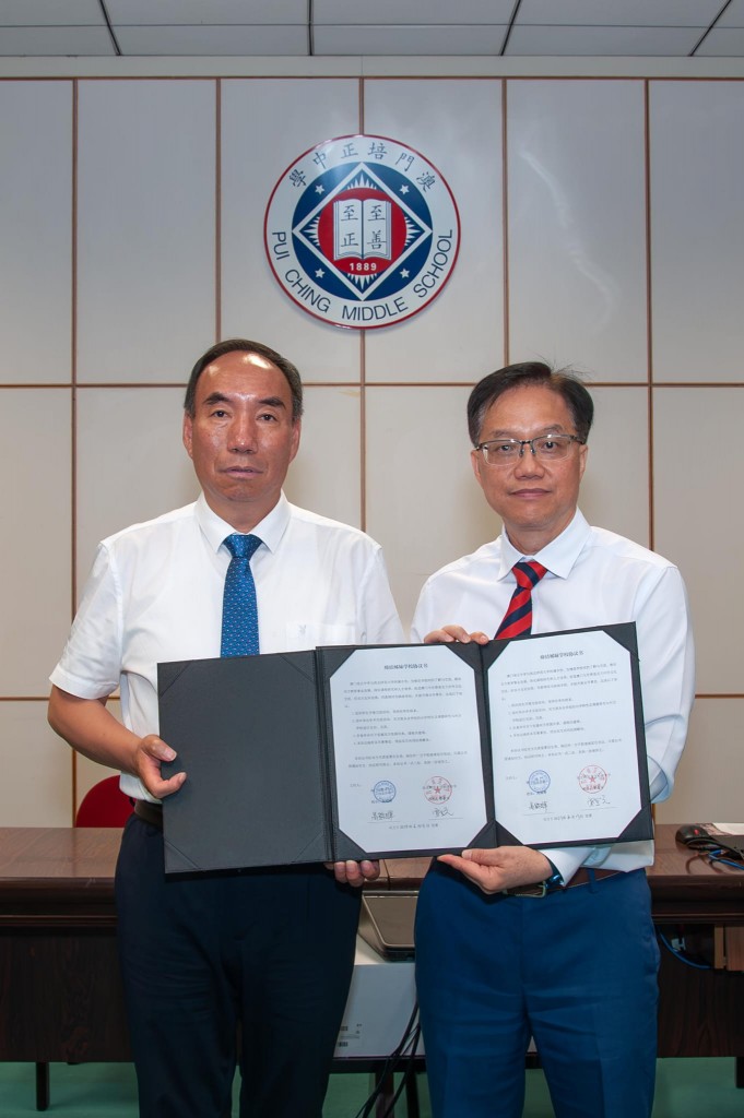 簽約儀式於今天上午在本校舉行,高錦輝校長代表澳門培正中學,與代表西北師範大學附屬中學的賈金元校長簽署合作協議。兩校將透過一系列交流活動、學術活動及人員互訪等合作,深化課程研究和人才培養,同時促進澳門與甘肅省文化往來。