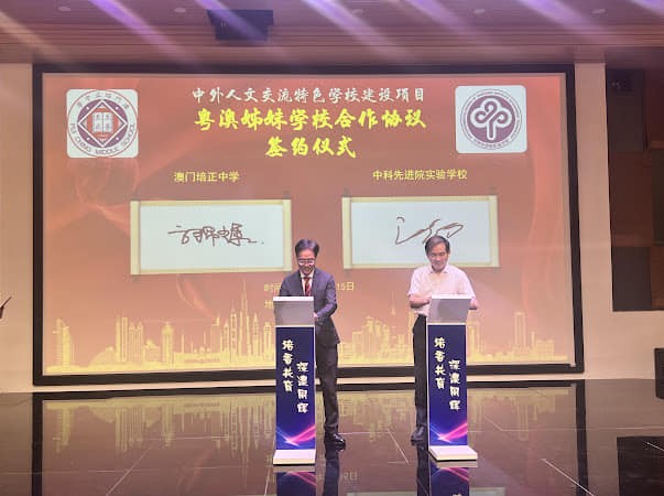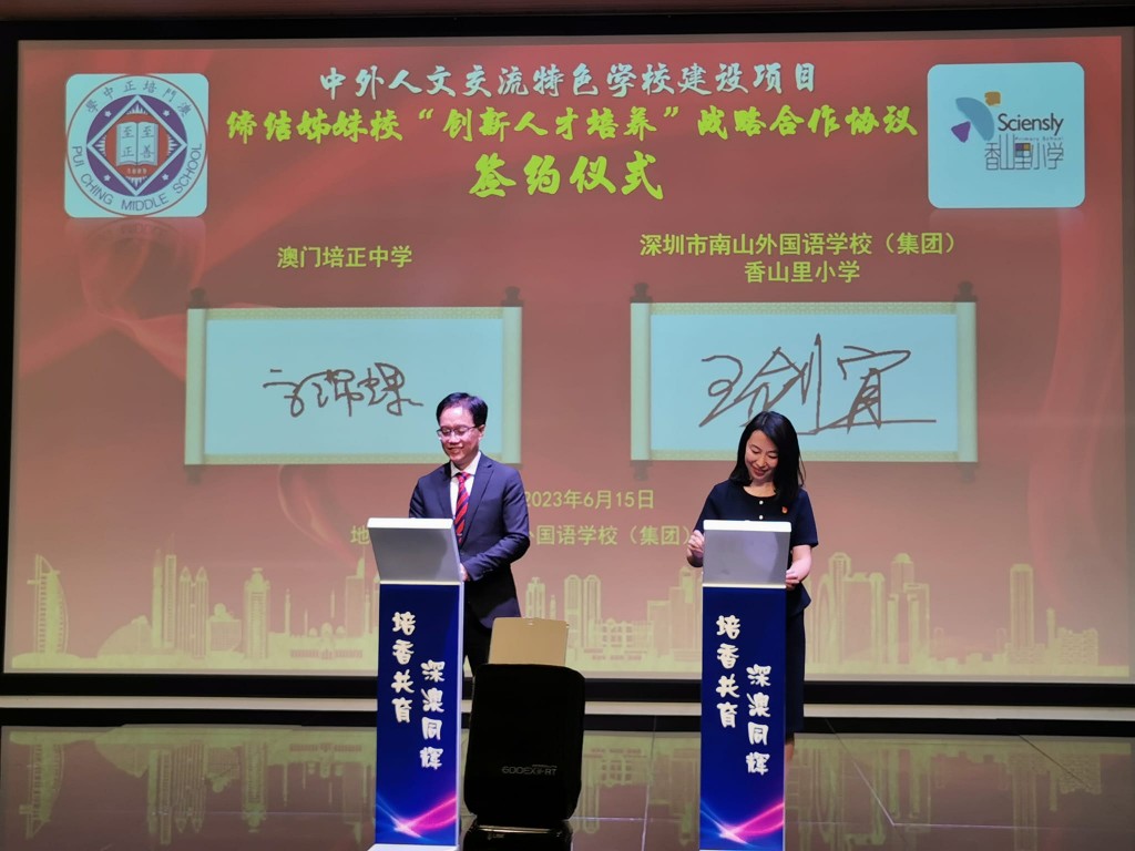 在深圳市南山區教育局領導和澳門、深圳兩地教師的見證下,本校分別與深圳市南山外國語學校(集團)香山里小學、中科先進院實驗學校簽約締結為姊妹學校,共同結下“培香共育,深澳同輝”的教育情誼。