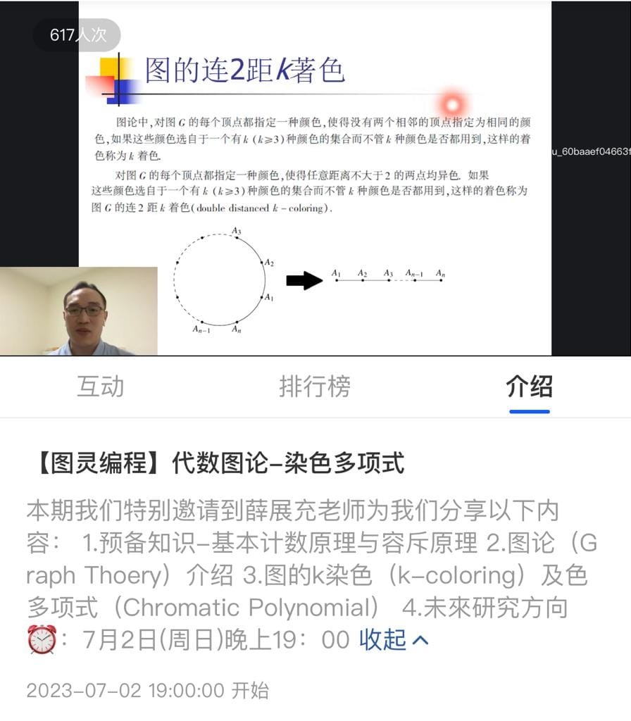 此次講座對象為大灣區的中學生、教師及數學研究人員,薛老師分享其十多年有關《圖染色計數》的研究成果,期間互動熱烈,收穫滿滿。