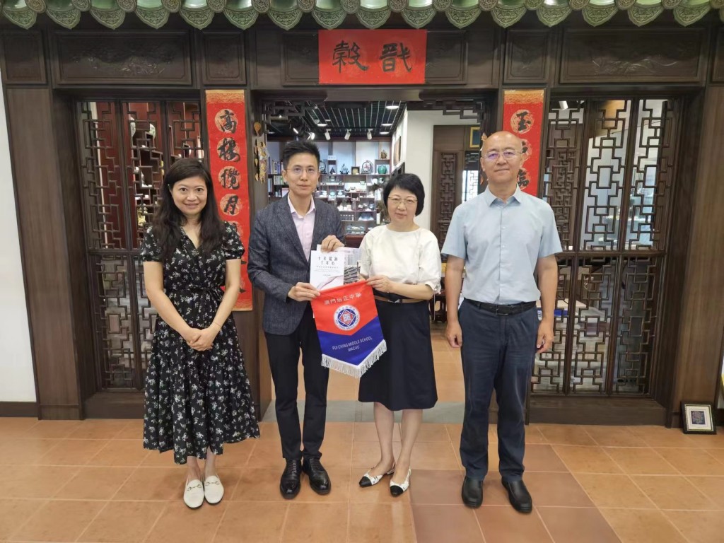 7月26日早上,北京市教育委員會二級巡視員、港澳台辦公室徐建姝主任、北京市海淀區教育工委史懷遠副書記、北京市教育委員會港澳台辦公室刁文淇幹部,連同澳門教育及青年發展局中學教育處林嘉誠代處長到訪本校,由陳敬濂副校長、楊珮欣副校長接待。嘉賓們從參觀中華文化館及FabLab創新科教館來了解本校的課程設置,以及澳門整體的教育概況,尤其對於教材的使用、每周授課的安排等均感興趣,嘉賓們對於本校利用創科作品來弘揚中華文化,予以肯定,並從北京和澳門的Pisa成績來探討兩地學生的教學模式雖然不同,但學生同樣有高質量的發展表示認同。