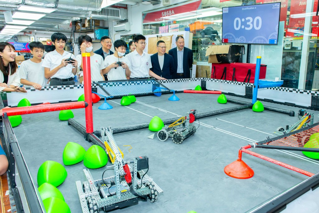 在參觀期間,嘉賓們聽取了相關科目老師的介紹,了解本校如何透過訓練動手能力和創造力來鼓勵同學們從錯誤中學習。同學們也主動分享了他們的工程筆記,介紹了改良機械人的步驟和思考過程,並透過一場精彩的機械人對決展示成果。