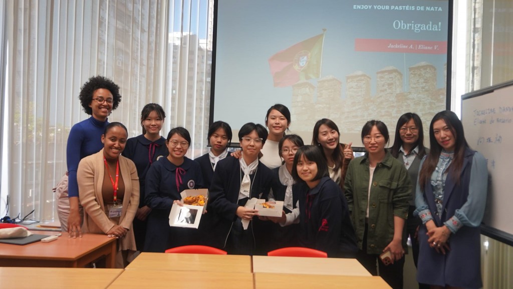 吳欣霞老師帶領高二學生何欣樺、劉千悅及謝愷晴接待,陪同到訪師生體驗校園生活,參與了國際關係、音樂、設計與科學、葡國語言與文化等課程。一同享用午飯並聊天交流後,來自香港學校的學生更帶來了精彩的花式跳繩表演。本校校董何建宗教授亦到場為交流師生們進行分享會,講述他的科研之路,勉勵同學們認清目標、不斷奮進。交流活動尾聲,我校三位學生接受黃楚標中學的學生採訪,即席互相分享了港澳兩地的學習、升學與人生的看法。