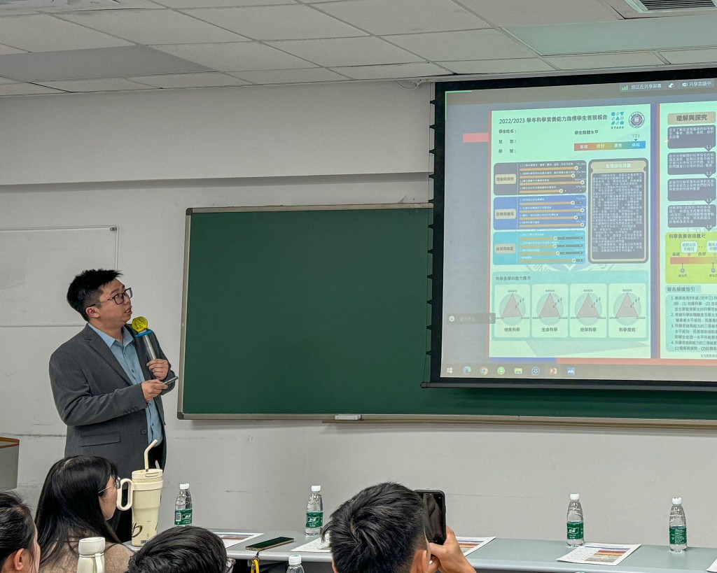 交流會上,北京師範大學中國基礎教育品質監測協同創新中心溫紅博副主任和張生教授,連同澳門大學教育學院張國祥教授、薛寶嫦副教授及其團隊,開展了一系列教育監測評估專題講座,系統地介紹國家教育質量監測、PISA和TIMSS研究的最新進展。會上,陳健鴻老師更以「校本科學素質測試系統的建立」為題,代表本校向一眾教育者,分享了我校科學科在校本評估監測中取得的成果。