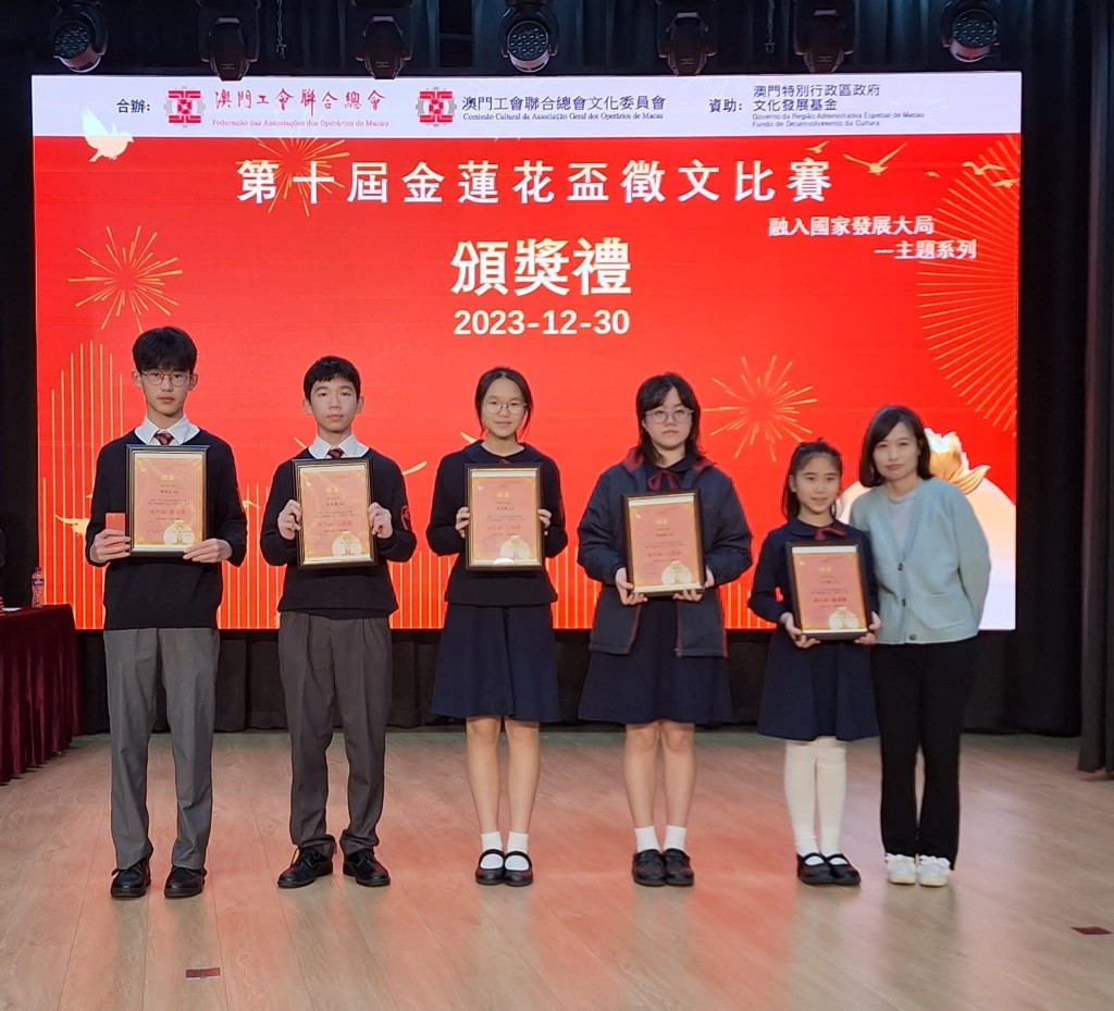 我校學生早前參加由澳門工會聯合總會、工聯文化委員會合辦,澳門特別行政區政府文化發展基金贊助的「第十屆金蓮花盃徵文比賽」,表現積極,獲取佳績。主辦單位今天假澳門工聯青年中心舉行頒獎典禮,獲獎學生包括: