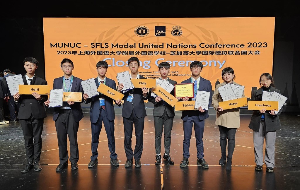 2023年12月14日,八位中學同學在吳欣霞老師帶領下前往上海,參加為期四天的「上海外國語大學附屬外國語學校 — 芝加哥大學國際中學生模擬聯合國大會(2023)」。活動吸引了超過200位來自全國的精英學生參加,我校代表就「發展中國家的心理健康」議題展開了熱烈和深入的討論及磋商。此次活動拓展了同學們的國際視野、協作能力及談判技巧等。來自芝加哥大學國際關係理事會暨芝加哥大學模擬聯合國的主席團對我校同學表現賦予高度評價,最終獲獎