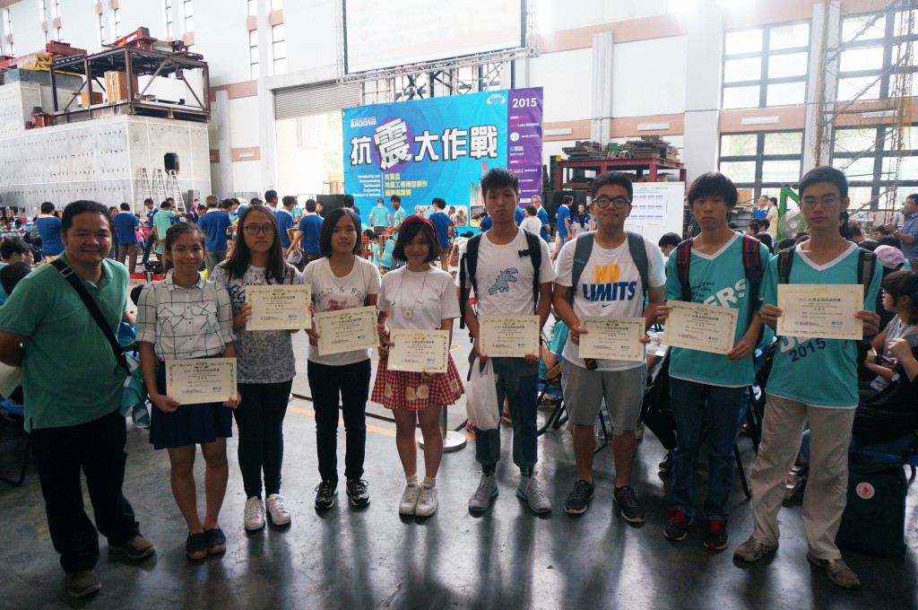 由台灣國家實驗研究院、台灣國家地震工程研究中心及英國文化協會合辦的2015抗震盃國際邀請賽於9月19、20日在台灣國家地震中心舉行。是次活動設有高中組、大學組及研究生組,分別有來自中國、香港、澳門、菲律賓、馬來西亞、日本、南韓、台灣等國家地區參加。本校為澳門唯一一所被邀請參與的學校,由梁沛津老師及胡俊明老師分別帶領八位高三理組同學(程鳳天、任凱翔、李騰峰、黃廷琛、陳采蓮、林泳彤、黃芊羚、陳紀螢)組成兩小隊參與,兩組同學所製作的模型均可在地震模擬震動台上承受到相等於七級以上地震威力之震動測試,其中有一組更可承受到900gal之震動測試。最後兩組同學均獲主辦單位頒發「耐震獎」獎狀。