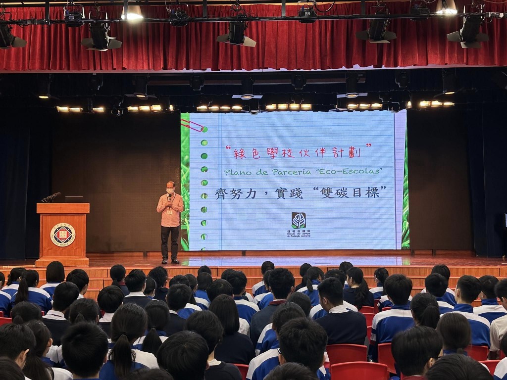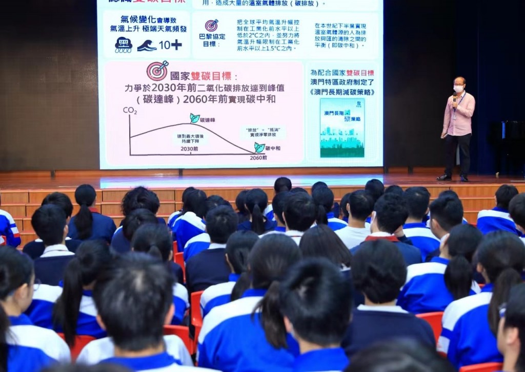 今天,高二、高三級學生參加了環境保護局主辦的「雙碳目標」講座。環境保護局代表趙旅龍先生從國際環境公約、國家雙碳目標再到澳門長期減碳策略一一展開介紹,學生深入認識到人類活動與全球暖化息息相關,更明白在生活中如何為環保出一分力。講者同時介紹了環境保護局舉辦一系列的減塑減廢活動,鼓勵學生推動全民源頭減廢,實現減碳目標,共享綠色生活。