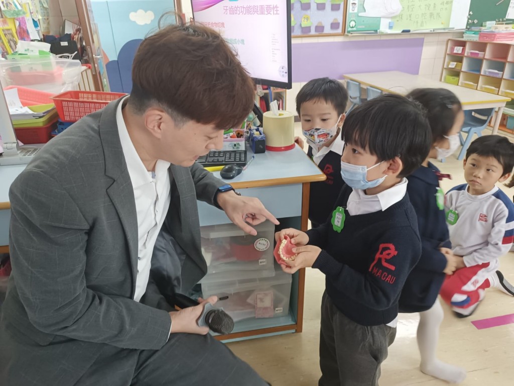 本校校友家長陳達牙科醫生應邀來校為幼高善班之探究教學——“保護牙齒戰隊”作分享。
