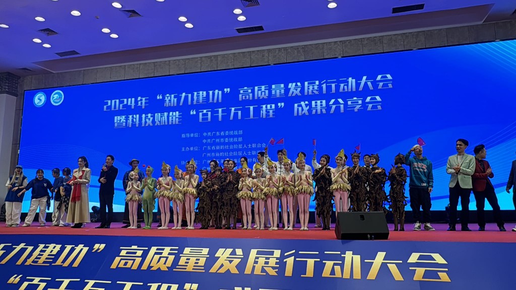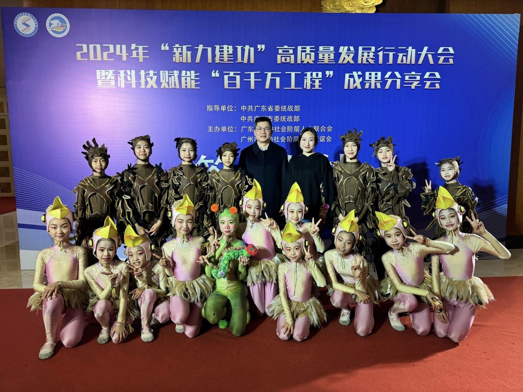 由中共廣東省省委統戰部、廣州市委統戰部指導,廣東省新的社會階層人士聯合會、廣州市新的社會階層人士聯誼會主辦的2024年“新力建功”高質量發展行動大會暨科技賦能“百千萬工程”成果分享會,於2月29日假廣州東方賓館會展中心舉行。本校小學舞蹈隊獲邀演出《雛鳥歡歌》,同學們演出栩栩如生,熱鬧非常,獲在場嘉賓高度評價。
