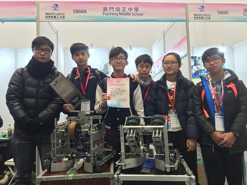 由中國科學技術協會舉辦之「世界機器人大會VEX機器工程挑戰賽」在北京舉行,本校閔好年老師帶領六位中學同學勞漢琛、伍建宏、林其隆、李昱浩、陳芍妤、顧旻峰於十一月下旬赴京參賽。在是次激烈的比賽中,本校高中組及初中組的同學表現積極,在兩岸四地各強隊中脫穎而出,獲得優異成績:高中隊獲一等獎和最佳活力獎,初中組獲三等獎。