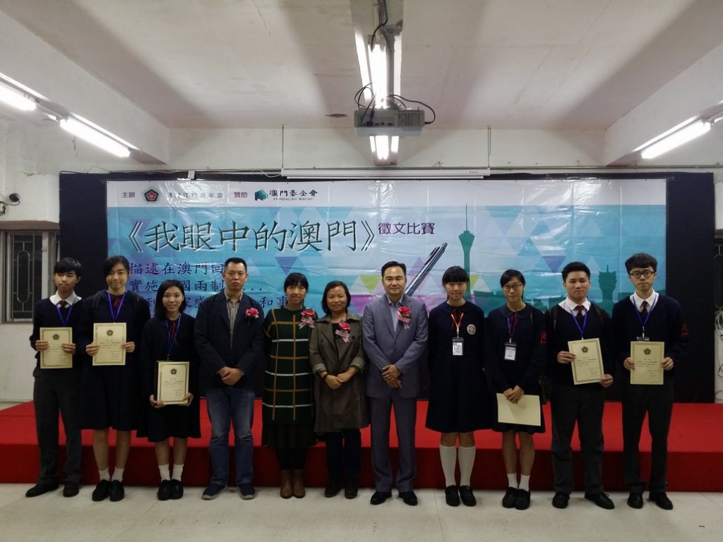 本校學生日前參加由澳門江門青年會主辦之"我眼中的澳門"徵文比賽頒獎典禮,成績優異,其中梁翊翀獲一等獎,李綺琪、陳均瑜、黃妍獲二等獎,郎雨萱、林逸飛、黃惠玉、關芷恩、陳穎姿、周澤謙獲三等獎。