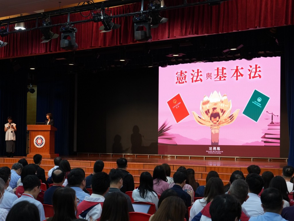 為推進校園法治宣傳教育,增強教師法律意識,培養遵紀守法的良好習慣,由法務局與教育及青年發展局聯合舉辦之「法治宣傳教育校園」計劃——教師法律培訓,於8月26日下午在本校禮堂舉行,法務局高級技術員羅麗萍向本校教學人員圍繞主題進行分享。