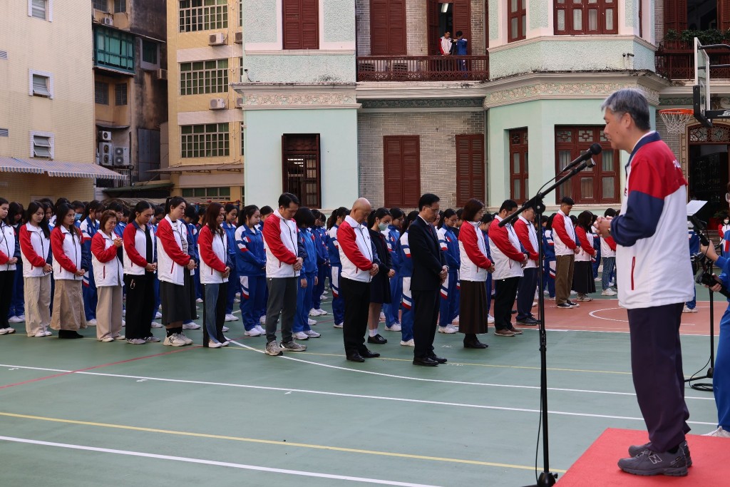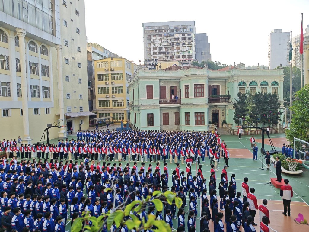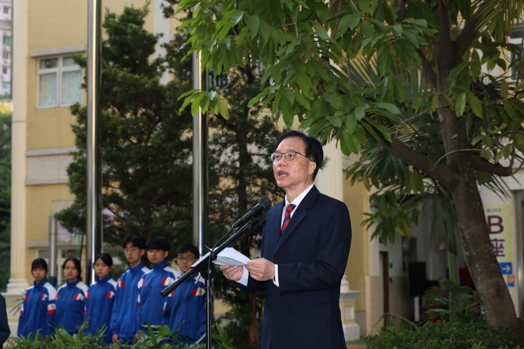 其後,高錦輝校長發表講話。他表示,站在國旗與區旗之下,全體師生充滿自豪與感恩。過去一年,培正中學在特區政府與社會各界支持下穩步成長,不斷優化教學環境、推動課程創新,而特區的各項教育政策也為師生搭建了堅實的成長平台。他強調,澳門雖小但志向深遠,本校學生在國際評估中屢創佳績,眾多優秀畢業生成功走進海內外一流大學,這生動印證了澳門教育蘊含的蓬勃生機。