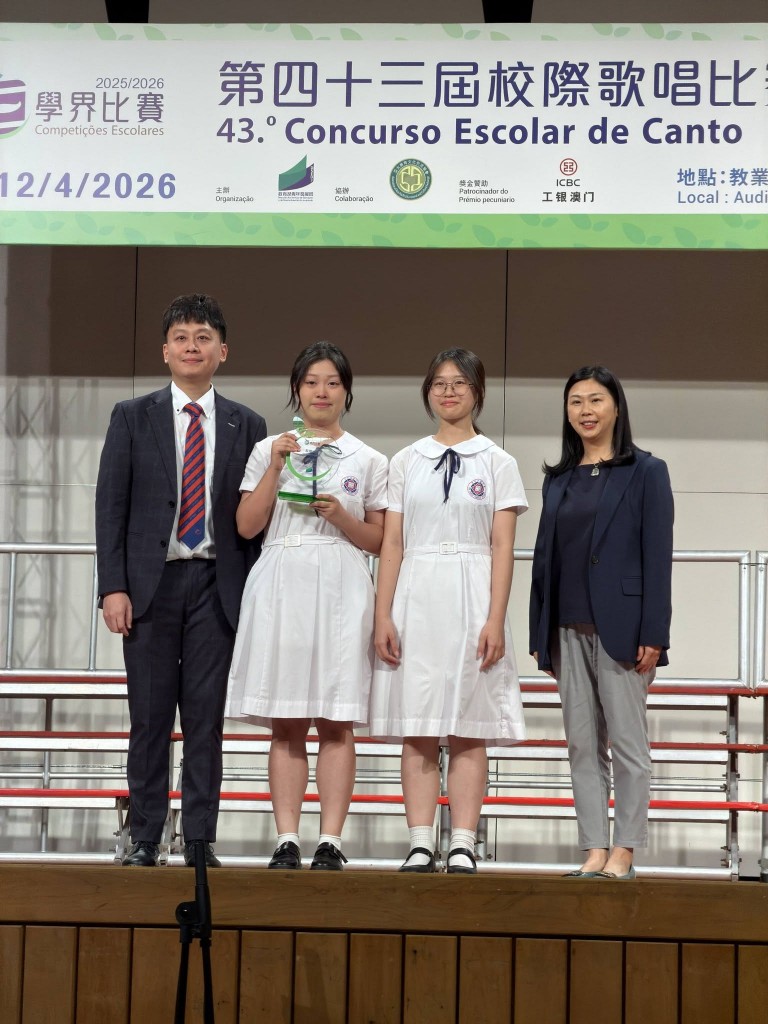 第四十三屆校際歌唱比賽中學組賽事4月11日舉行,本校歌詠隊演唱《Sixteen Tons》、《新的一天》兩曲,奪得優異級(最高級別)獎項。