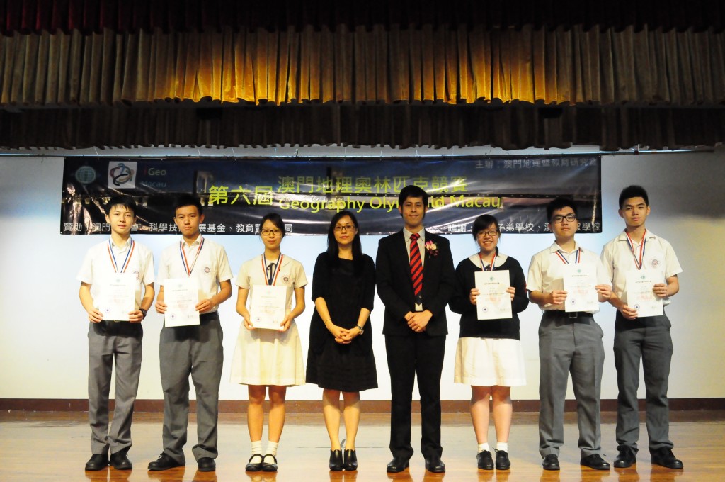 2016年4月10日本校周慧心老師帶領“地理奧林匹克競賽小組”8位同學參加由澳門地理暨教育研究會所舉辦的2016年第六屆澳門地理奧林匹克競賽,5月21日假澳門坊眾學校參加頒獎典禮,共獲得個人四個銀奬和四個銅獎的佳績。獲得銀獎的同學分別是高二級梁頌宏、潘凌子、高一級何潤景、李奕儒,獲得銅獎分別是高二級余澄觀、曾浩倫、鄭舜彥、高一級呂乾亨。此外,本校周慧心老師和譚達賢老師亦獲該會頒發的優良教師證書,以示鼓勵。恭喜各位得獎老師和同學。