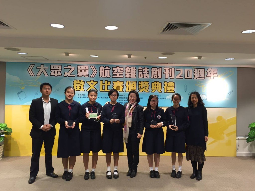本校同學參加由新濠江報業集團《大眾之翼》航空雜誌主辦的「《大眾之翼》航空雜誌創刊20週年」徴文比賽中喜獲佳績。高一信譚健禧獲一等獎,高二善黃靖琳獲二等獎,高二善林曉欣獲三等獎,高二信張雅雪、高二愛徐心暘、高一信陳思愉、高一望林欣蓉獲優異獎,本校同時獲得團體優異獎。