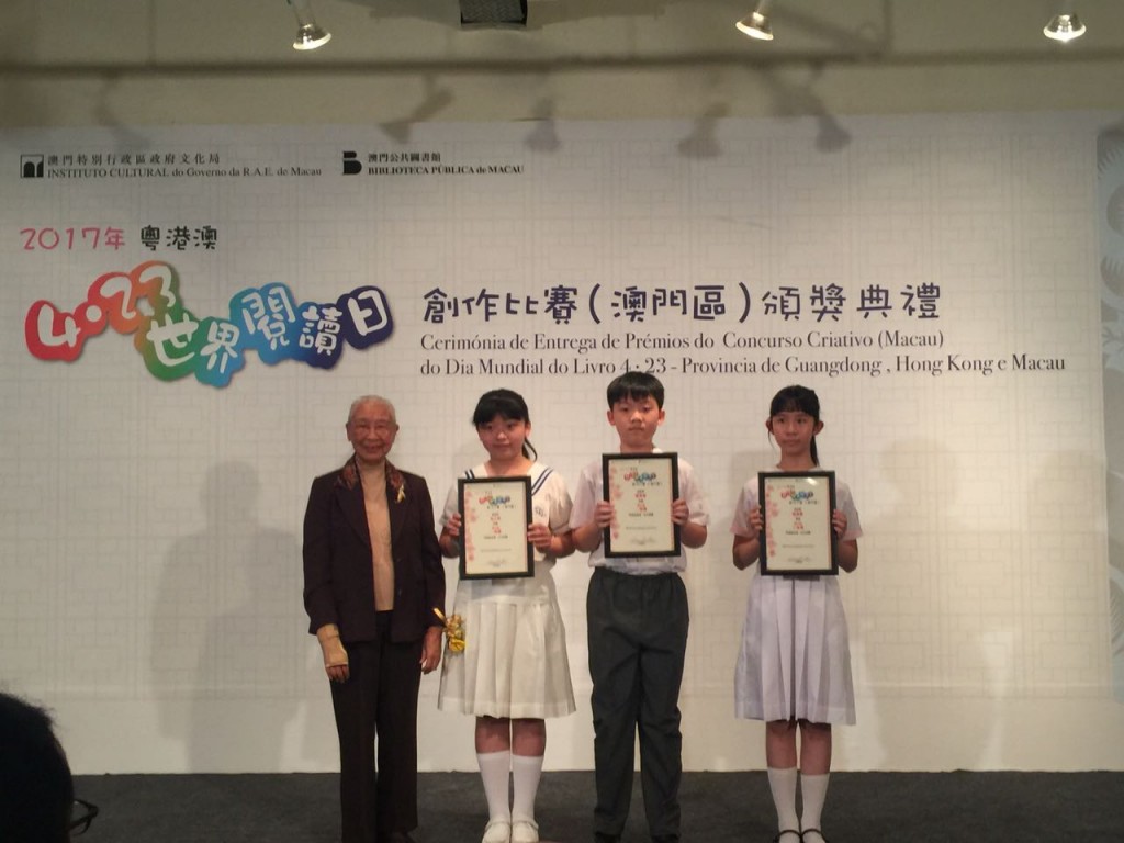2017年粵港澳4.23世界閲讀日創作比賽(澳門區)頒獎典禮於今天舉行,本校陳俊康同學獲得高小組二等獎,獲優異獎同學包括:(初小組)鄧希悅、(中小組)趙康瑤、(高小組)蘇可瑜、麥嘉恩、何曉晴、何柏炘、韓冷、(高中組)黃亦韻、許穎心、鄒雨豪。