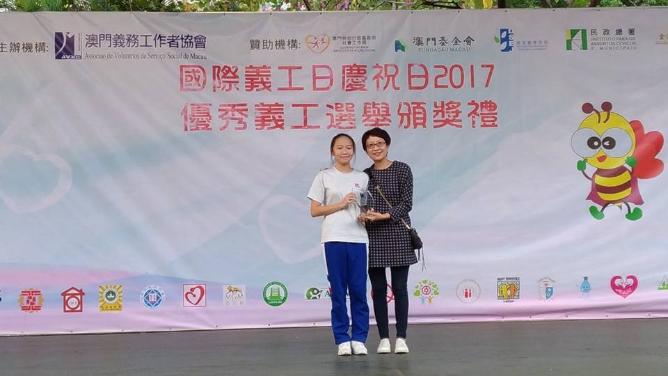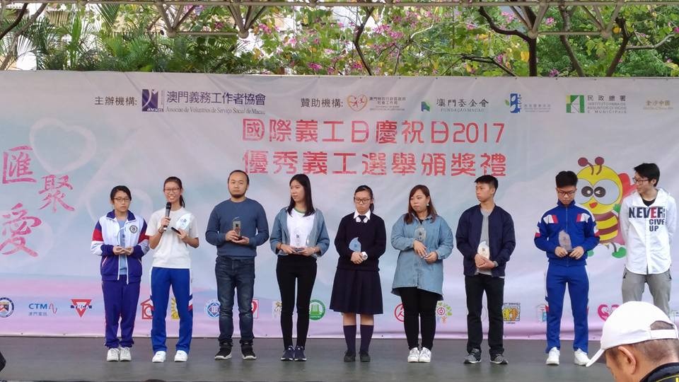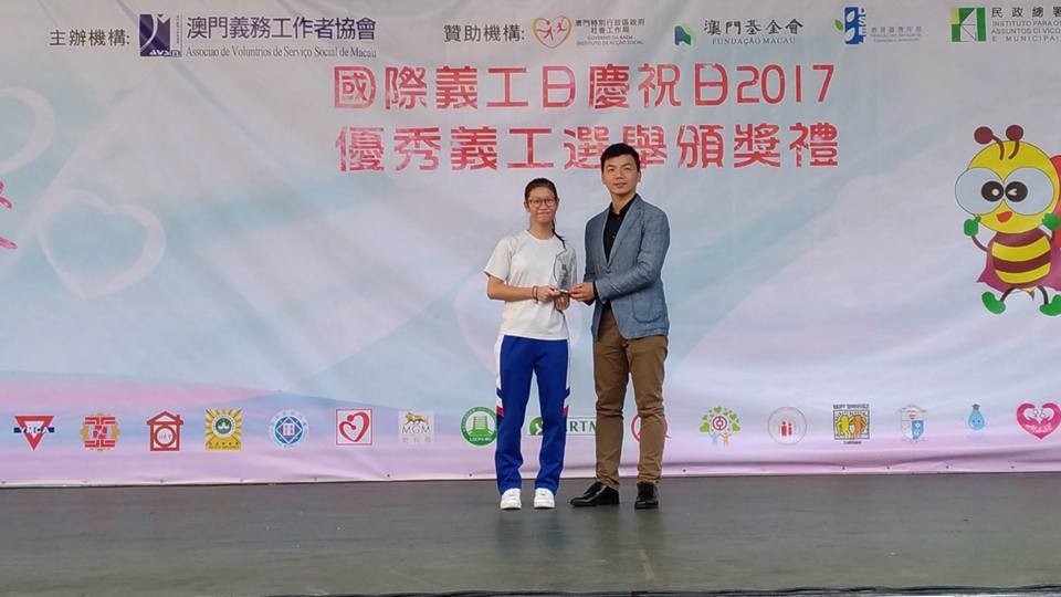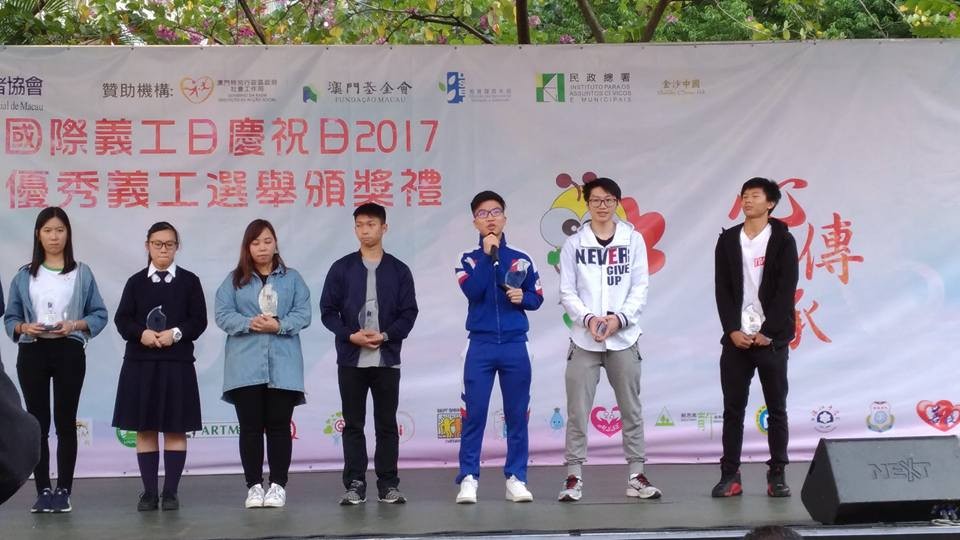 由澳門義務工作者協會主辦之2017優秀義工選舉頒獎禮於今天下午假黑沙環祐漢公園舉行,本校義工隊多位表現出色的隊員獲提名推薦參與,經過面試及義務經驗評分環節,多名成員獲獎,恭喜恭喜。以下為獲獎名單: