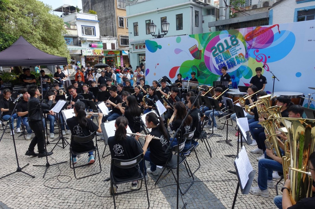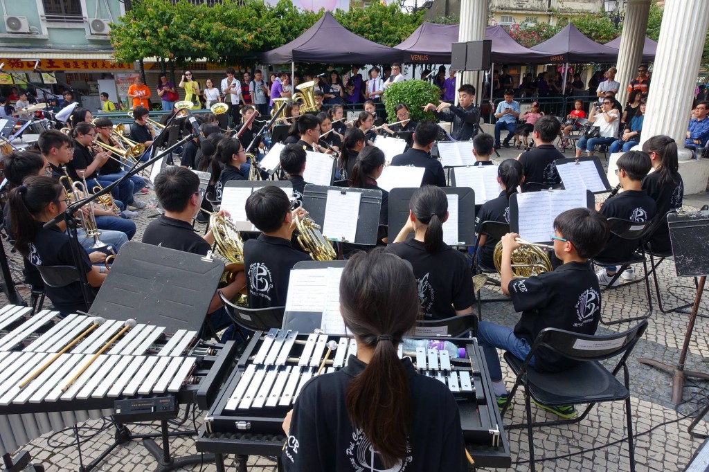 本校管樂團今天下午在氹仔嘉模墟參與教青局主辦的「校園樂繽紛」演出,樂團獻上名曲多首,不少市民及遊客駐足欣賞。