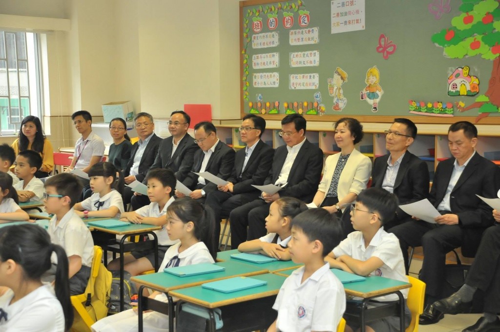 調研團先觀摩了一節小學中文教學活動課。學生在施虹冰老師引領下用粵語和普通話朗誦、吟唱兩首古詩,並積極與嘉賓互動。課後,嘉賓向學生代表贈書。
