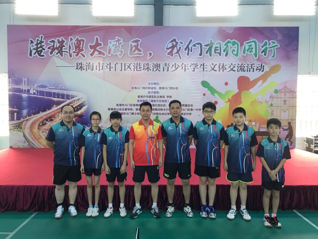 梁健華老師、黃智中老師帶領本校五位學生參加為期兩天的珠海市斗門區港珠澳青少年學生文體交流活動,與著名乒乓球教練李靜合照。