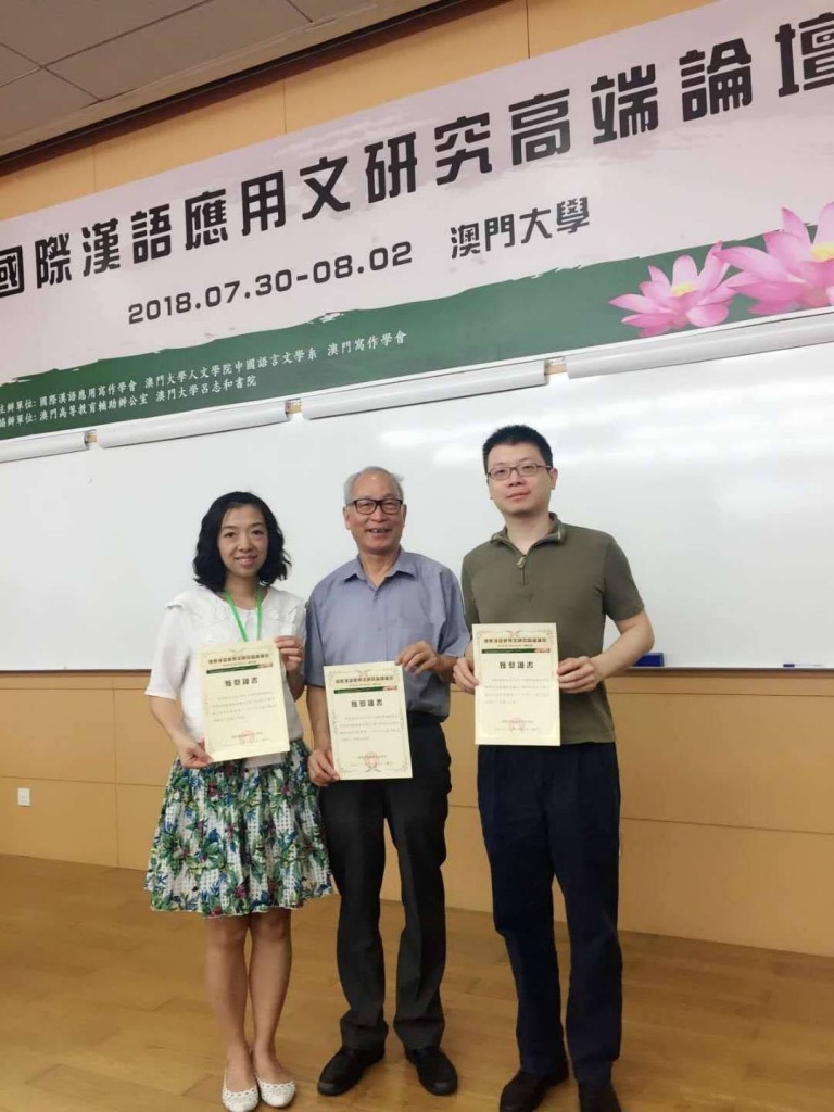 本校麥芷琪老師與鄧景濱教授、金偉德先生以團隊形式參加由國際漢語應用寫作學會、澳門大學人文學院中國語言文學系、澳門寫作學會主辦的「國際漢語應用文研究高端論壇」,論壇由7月30日至8月2日在澳門大學舉行。麥芷琪老師、金偉德先生代表團隊發表題為《澳門創思公文電子範本的設計與應用——中外公文電子範本的優化》,並獲得優秀論文二等獎。