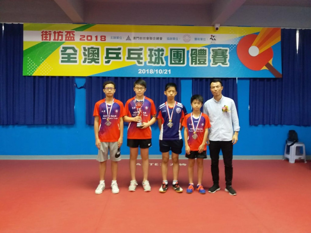 2018街坊杯全澳乒乓球團體賽閉幕,本校蘇俊熙(初二信)、張浚軒(初二望)、楊文政(初一信)、霍展聰(初一望)隊伍獲季軍;許浩桓(初二愛)、朱震濠(初二愛)、鍾健濠(小六愛)、何天倫(小六愛)獲殿軍。