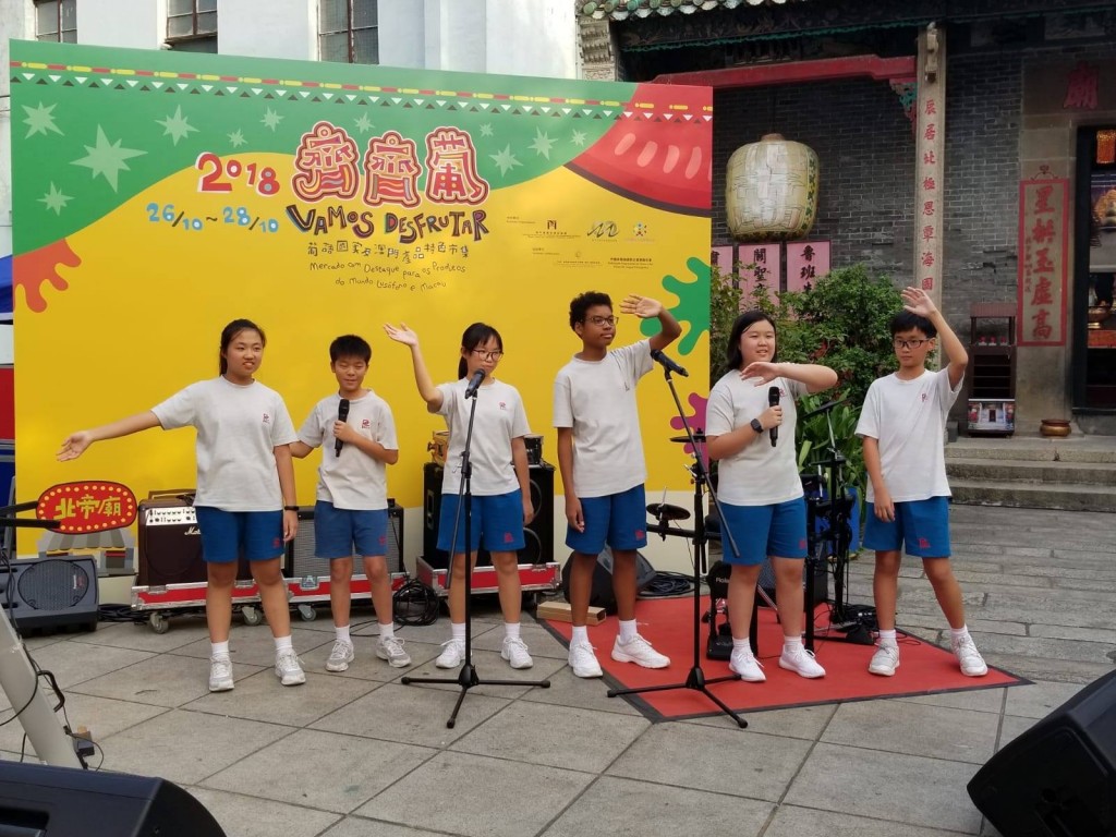 今天下午,本校六位初中同學在氹仔北帝廟前地舉行的“齊齊葡”活動上,現場演唱了葡語歌曲“Um Lugar Ao Sol”。同學們的精彩演出,獲得大家掌聲讚賞。