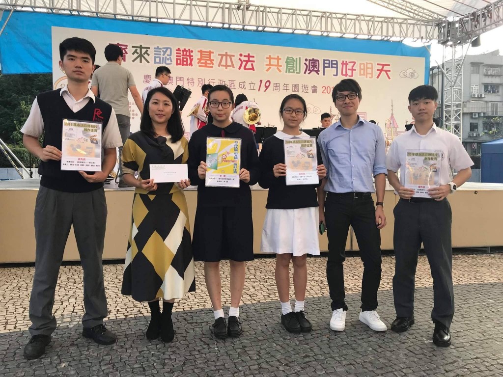 「齊來認識基本法 共創澳門好明天----慶祝澳門特區成立19周年園遊會」,今午於塔石廣場隆重舉行。澳門特別行政區政府、中央駐澳門特別行政區聯絡辦、外交公署等部門負責人出席並主禮,同時向多項比賽獲奬者頒獎。本校高二善班陶昶獲「基本法演示文稿PowerPoint設計比賽」第三名,鄧毅靜老師獲優秀指導教師奬;初三望班林芷愉、高三望班錢昊翔、林昆煥、劉肇希、張浚傑、羅昊燊、黃宇軒亦獲得「基本法宣傳短片創作比賽」優秀奬。