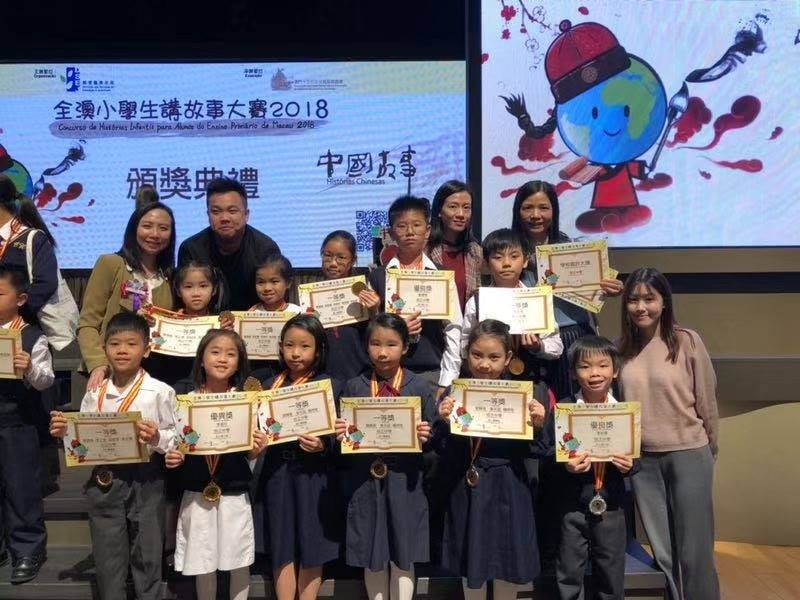 由教育暨青年局青年試館主辦的“全澳小學生講故事大賽2018”今午舉行頒獎典禮。本校獲得“嘉許大獎”。小二李迪心同學獲初小個人組優異獎,小一李柏熹獲初小個人組一等獎;小四李永雋、小五賈子驁、小六鄭君博均獲高小個人組一等獎;小三謝淵楨、陳上禮、劉俊傑、袁芷臻獲初小團體一等獎;小四劉曉蓓、黃天蕊、楊婷雅、吳穎桐、周子喬、高芷喬、蕭嘉穎、馮承騫、曾煒彬、龍思晴、李莘越獲高小團體組一等獎。