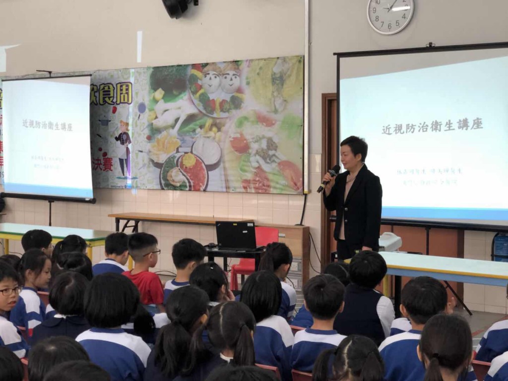 本年度健康飲食周以「飲食健康,保護視力」為主題。今日午間,在B座雨天操場舉行了護眼講座,由山頂醫院陸美嬋醫生及林嘉明醫生介紹近視的防治,教育同學愛護眼睛。講座後,莫鎧駿、黃昊泓同學利用他們研發的「主覺驗光儀」,為小學生測試視力。