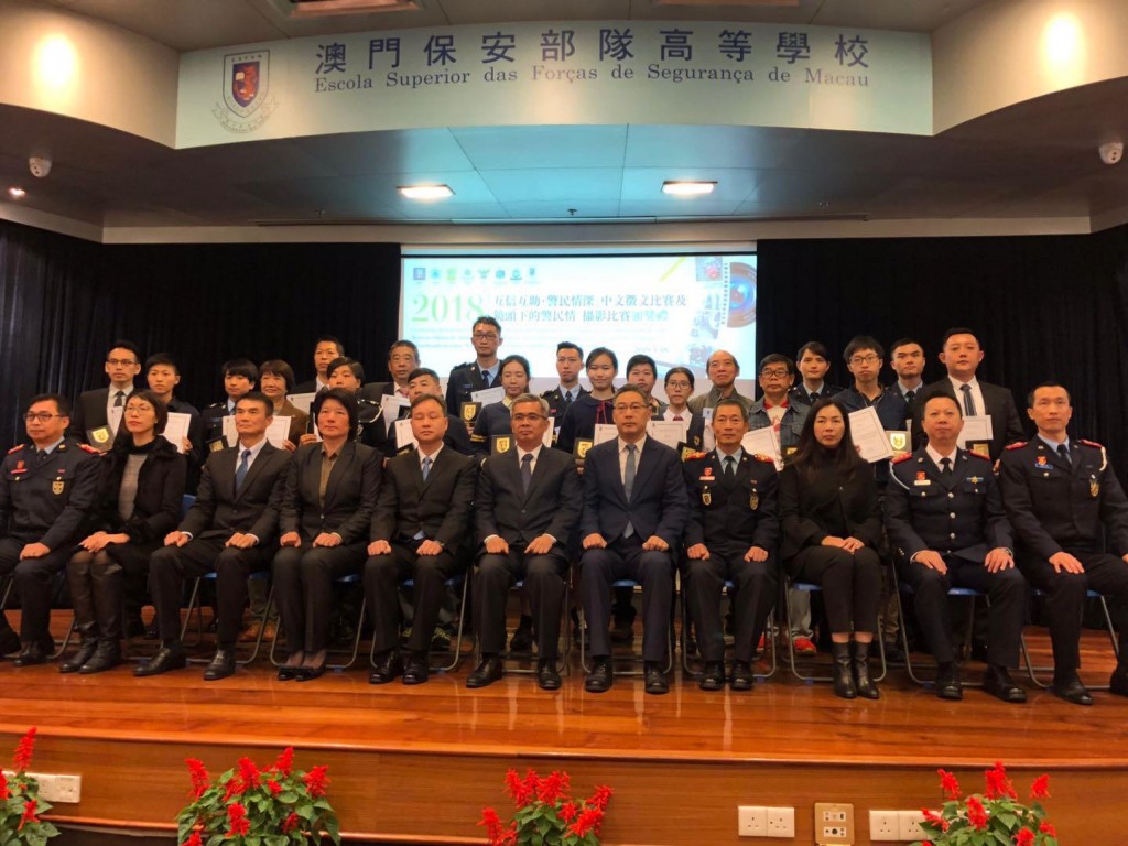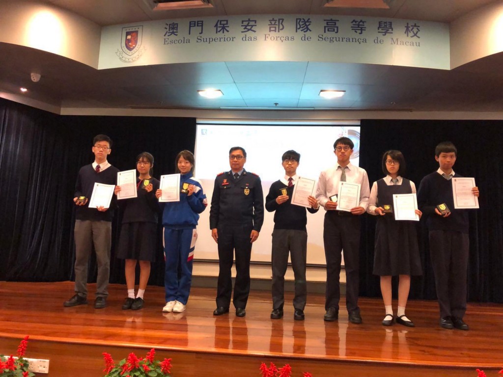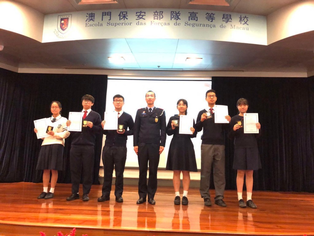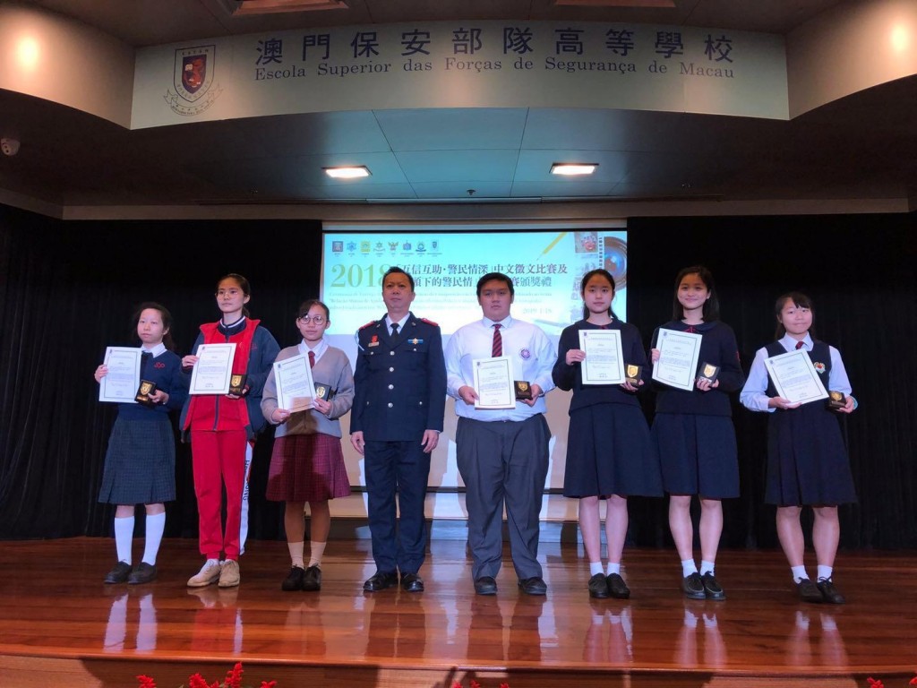 為了讓社會大眾與警隊人員共同參與,透過藝術領域的交流,拉近警民距離,攜手共建友善親民的警隊文化,澳門保安部隊及保安部門聯合舉辦了「互信互助‧警民情深」中文徵文比賽,該比賽頒奬典禮今早於澳門保安部隊高等學校禮堂舉行。本校是中文徵文比賽公開組-高中組別中奪得最多獎項的學校,獲得了亞軍1名、優異獎3名、入圍獎8名,依序是項一凡、高樂夷、鄺妍華、冼暉浩、林昆煥、王心妤、李欣笑、林承佑、劉穎蓉、胡鈞再、侯之琳、吳紀瑩,共12名學生獲獎,收穫豐富。