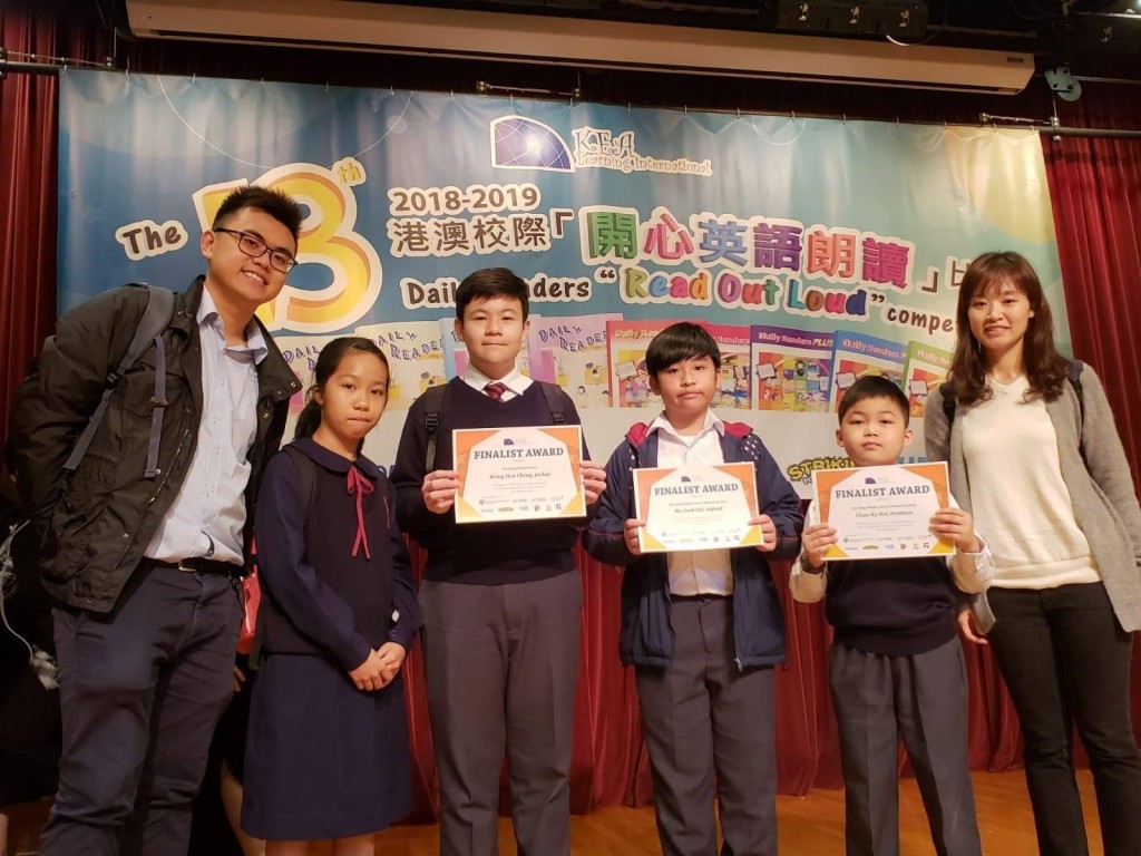 第13 屆港澳校際「開心英語朗讀」比賽今早在香港遊樂場協會優才發展及交流中心舉行,我校學生表現優秀,高小組胡碩孜及初中組黃浩政同時獲得優異獎,而初小組陳家熙及初中組何芯玥獲得入圍獎。